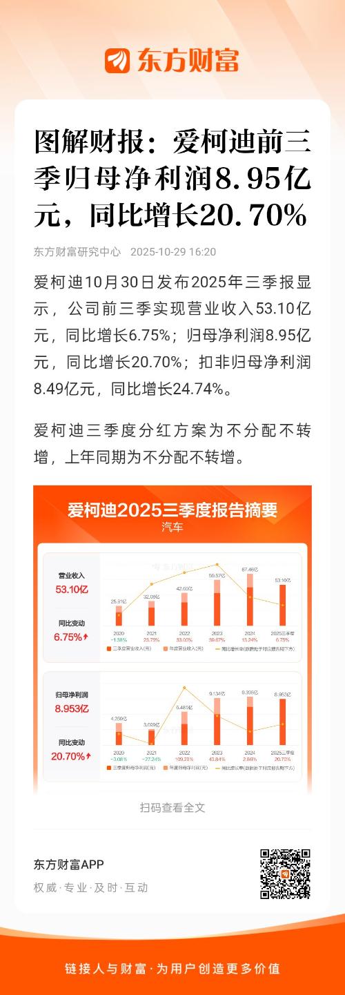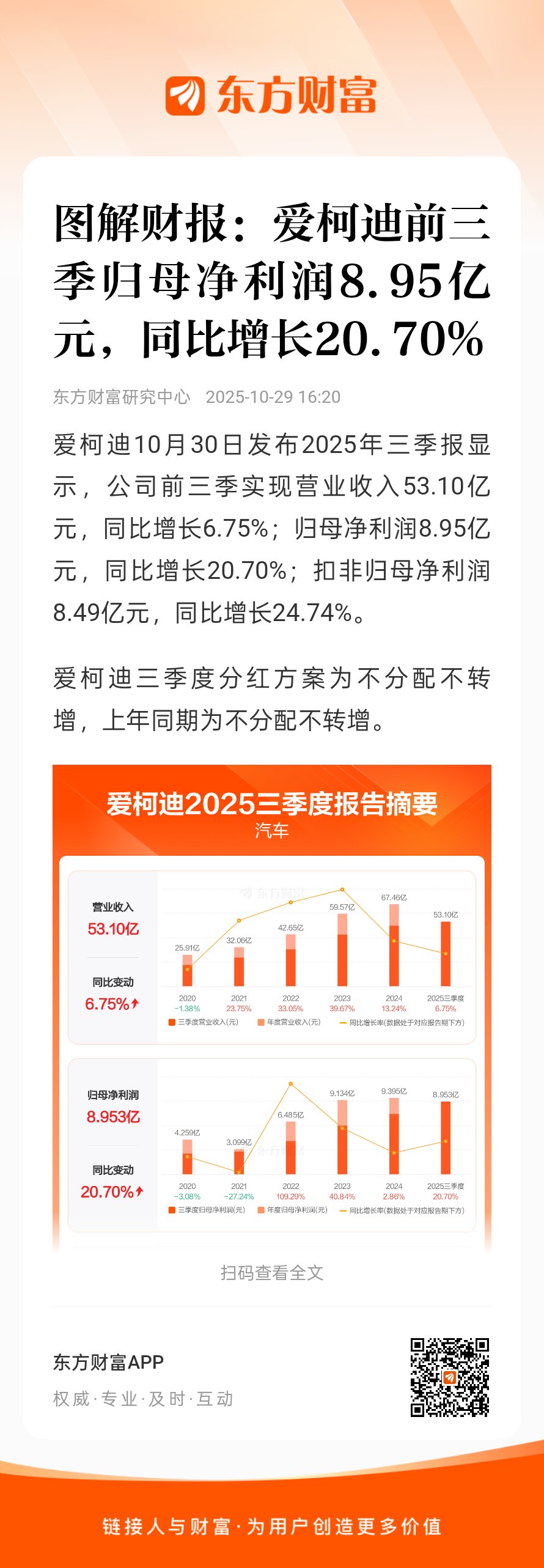 爱柯迪10月30日发布2025年三季报显示,公司前三季实现营业收入53.10亿元,同比增长6.75%;归母净利润8.95亿元,同比增长20.70%;扣非归母净利润8.49亿元,同比增长24.74%。