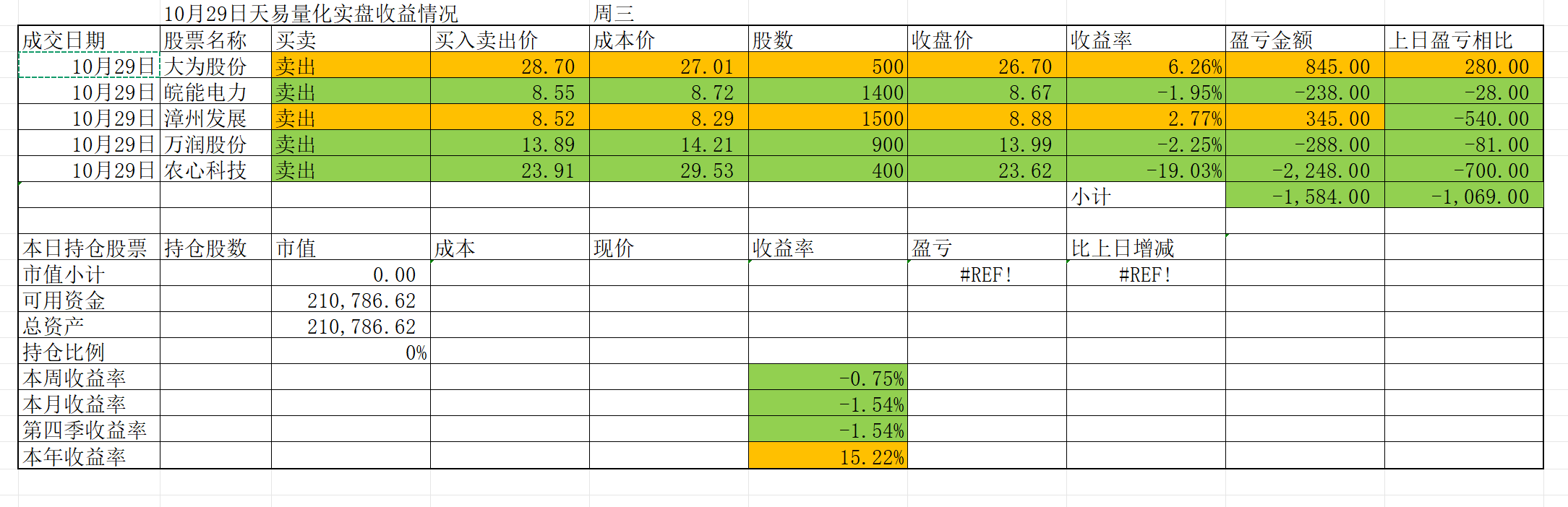 【10月29日天易量化实战复盘】漳州发展开盘跳水昨天亏损,今天肯定是不开仓的。昨