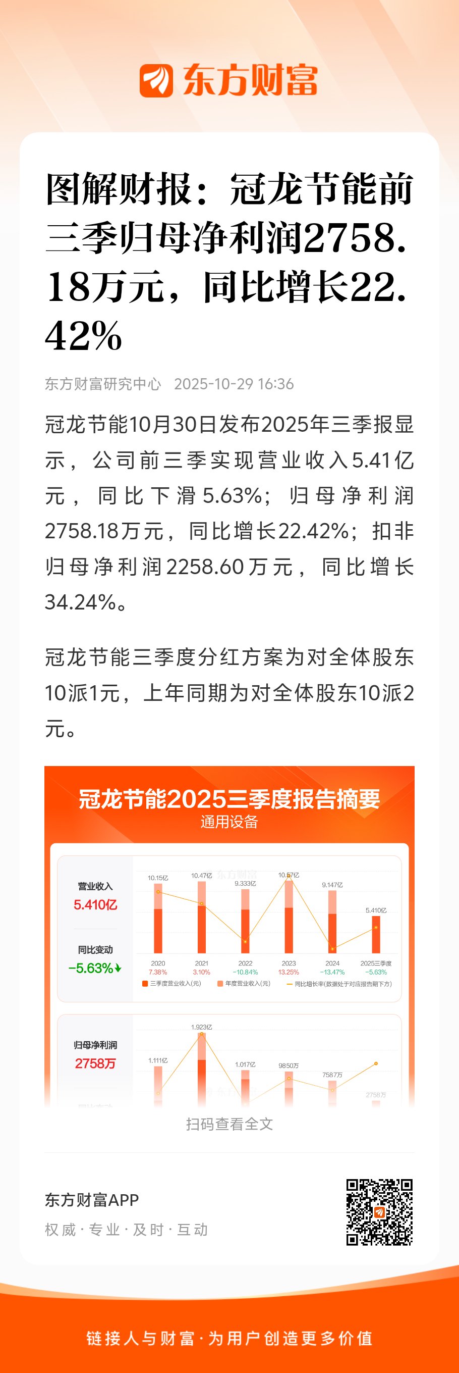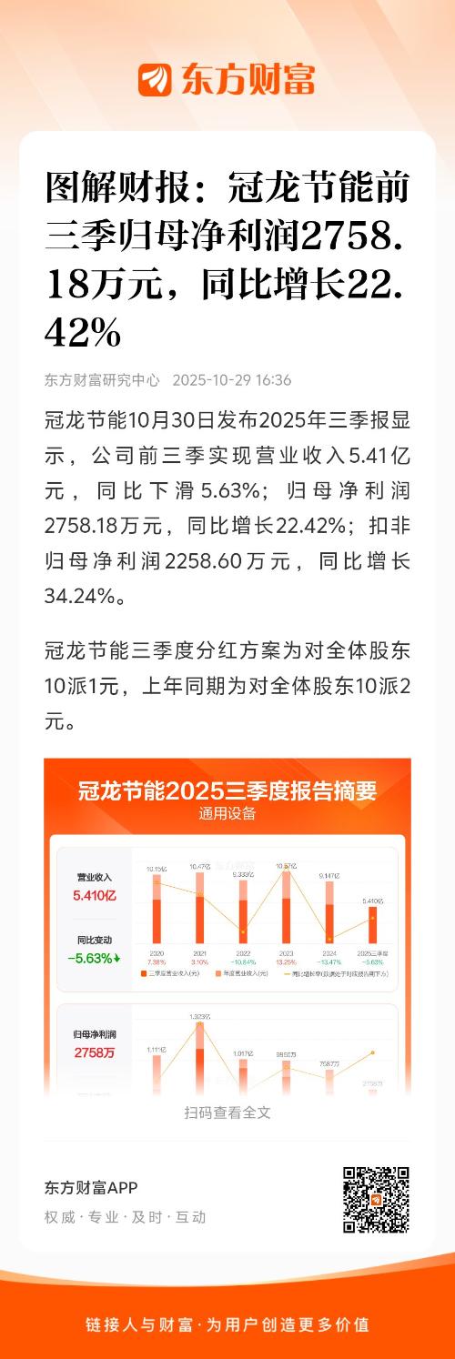 冠龙节能10月30日发布2025年三季报显示,公司前三季实现营业收入5.41亿元,同比下滑5.63%;归母净利润2758.18万元,同比增长22.42%;扣非归母净利润2258.60万元,同比增长34.24%。