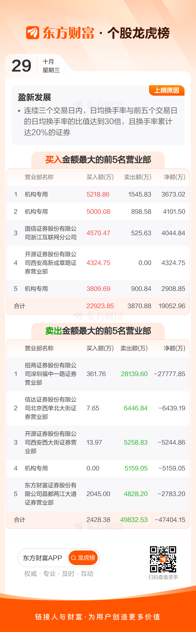 交易所2025年10月29日公布的交易公开信息显示,盈新发展因成为连续三个交易日内,日均换手率与前五个交易日的日均换手率的比值达到30倍,且换手率累计达20%的证券上榜。盈新发展当日收报3.04元,涨跌幅-4.70%,换手率23.12%,成交额34.69亿。异常期间10月29日至10月29日,期间涨幅-4.70%,累计偏离值23.12%,区间成交额34.69亿。
