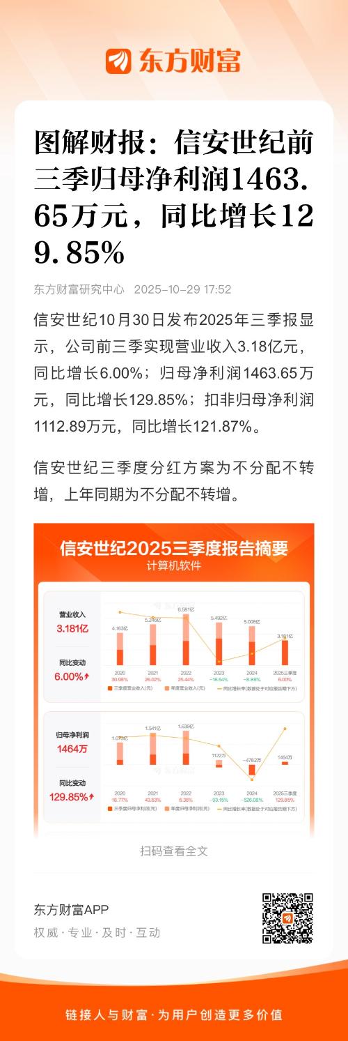 信安世纪10月30日发布2025年三季报显示,公司前三季实现营业收入3.18亿元,同比增长6.00%;归母净利润1463.65万元,同比增长129.85%;扣非归母净利润1112.89万元,同比增长121.87%。