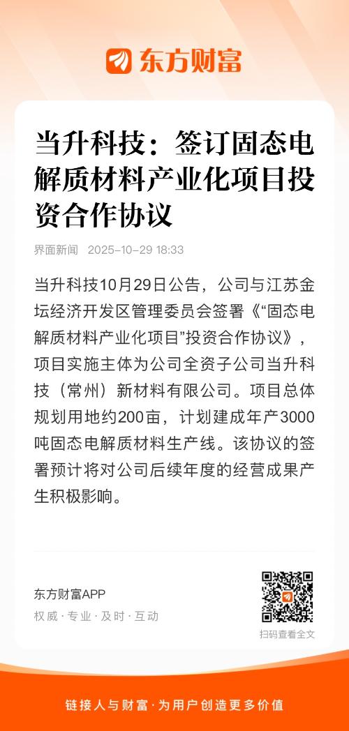 当升科技10月29日公告,公司与江苏金坛经济开发区管理委员会签署《“固态电解质材料产业化项目”投资合作协议》,项目实施主体为公司全资子公司当升科技(常州)新材料有限公司。项目总体规划用地约200亩,计划建成年产3000吨固态电解质材料生产线。该协议的签署预计将对公司后续年度的经营成果产生积极影响。