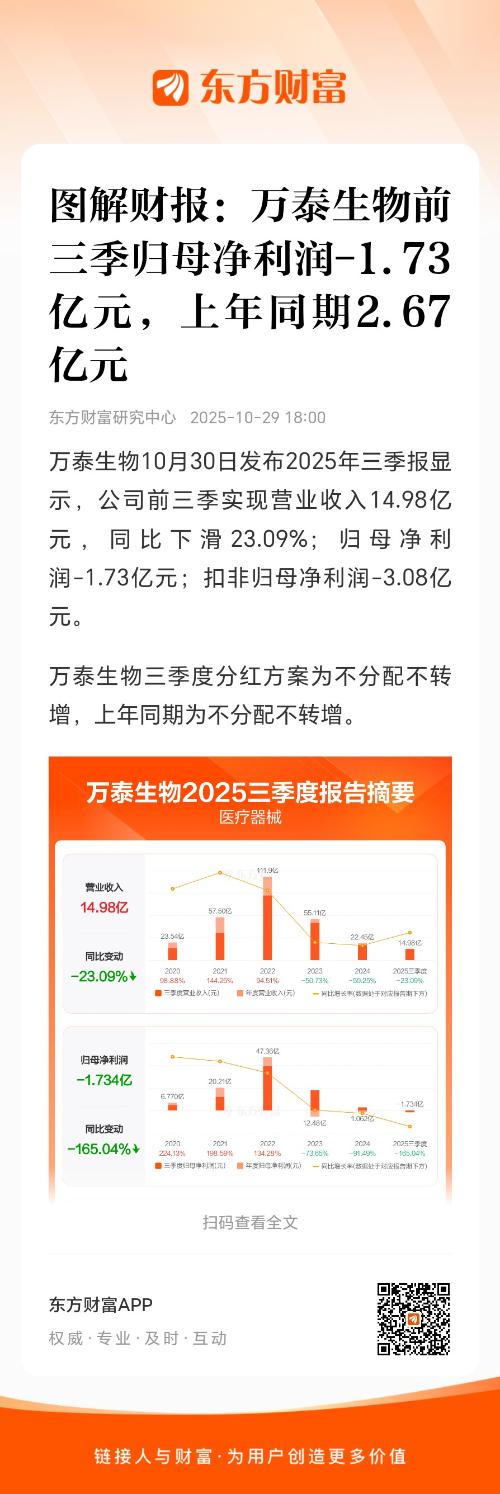 万泰生物10月30日发布2025年三季报显示,公司前三季实现营业收入14.98亿元,同比下滑23.09%;归母净利润-1.73亿元;扣非归母净利润-3.08亿元。