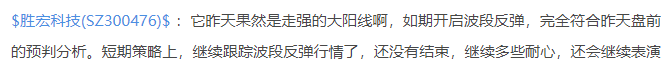 胜宏科技300476:它今日继续走强的状态,那就一点问题没有了,昨天的不利因素算是解除了。短期继续跟踪波段反弹吧,还是有望创出新高的。胜宏科技,是坤哥上周二早文挖掘的,当时说了它有望开启波段反弹了,位置的性价比优势已经出来了。当时分析还是非常明确的,坤哥从来都是讲在前头的。可以看到,近期连续反弹阳线的走势,表现是相当强势了。再次验证了坤哥的审美能力。