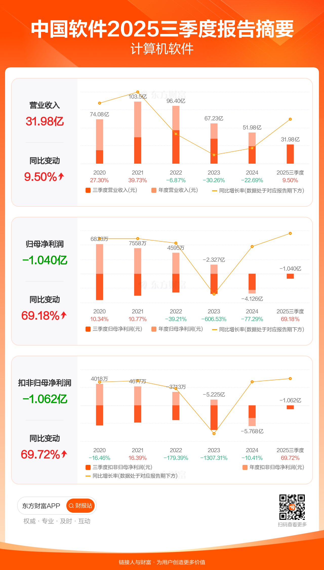 中国软件10月30日发布2025年三季报显示,公司前三季实现营业收入31.98亿元,同比增长9.50%;归母净利润-1.04亿元;扣非归母净利润-1.06亿元。