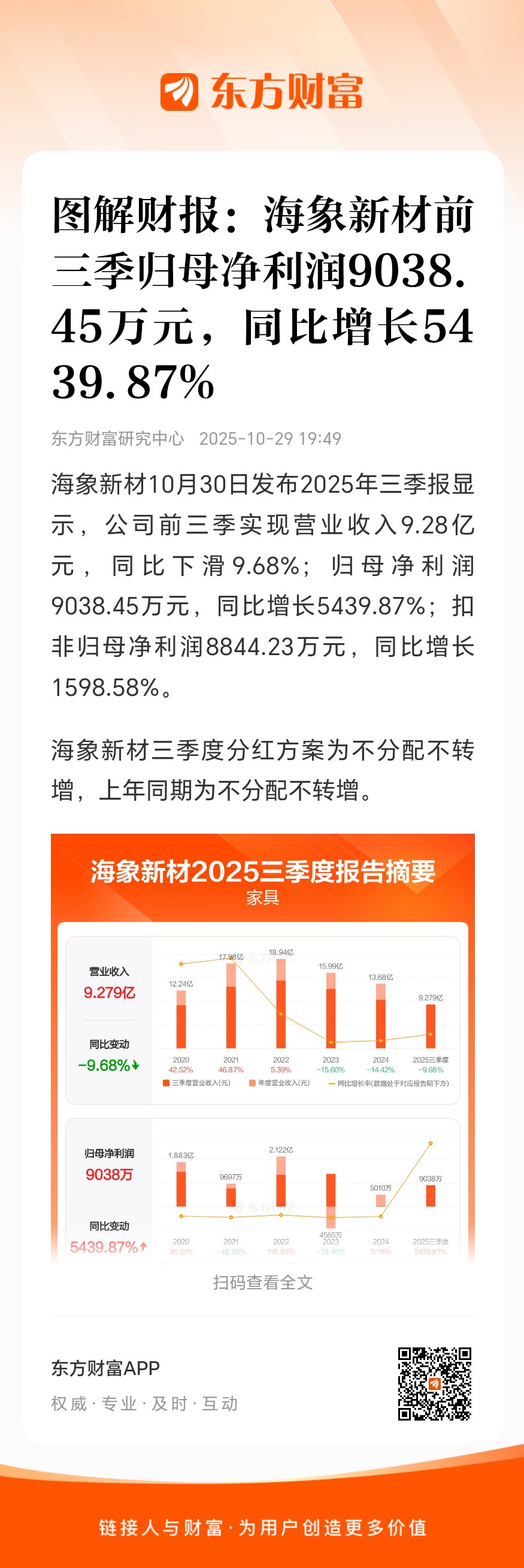 海象新材三季度分红方案为不分配不转增,上年同期为不分配不转增。