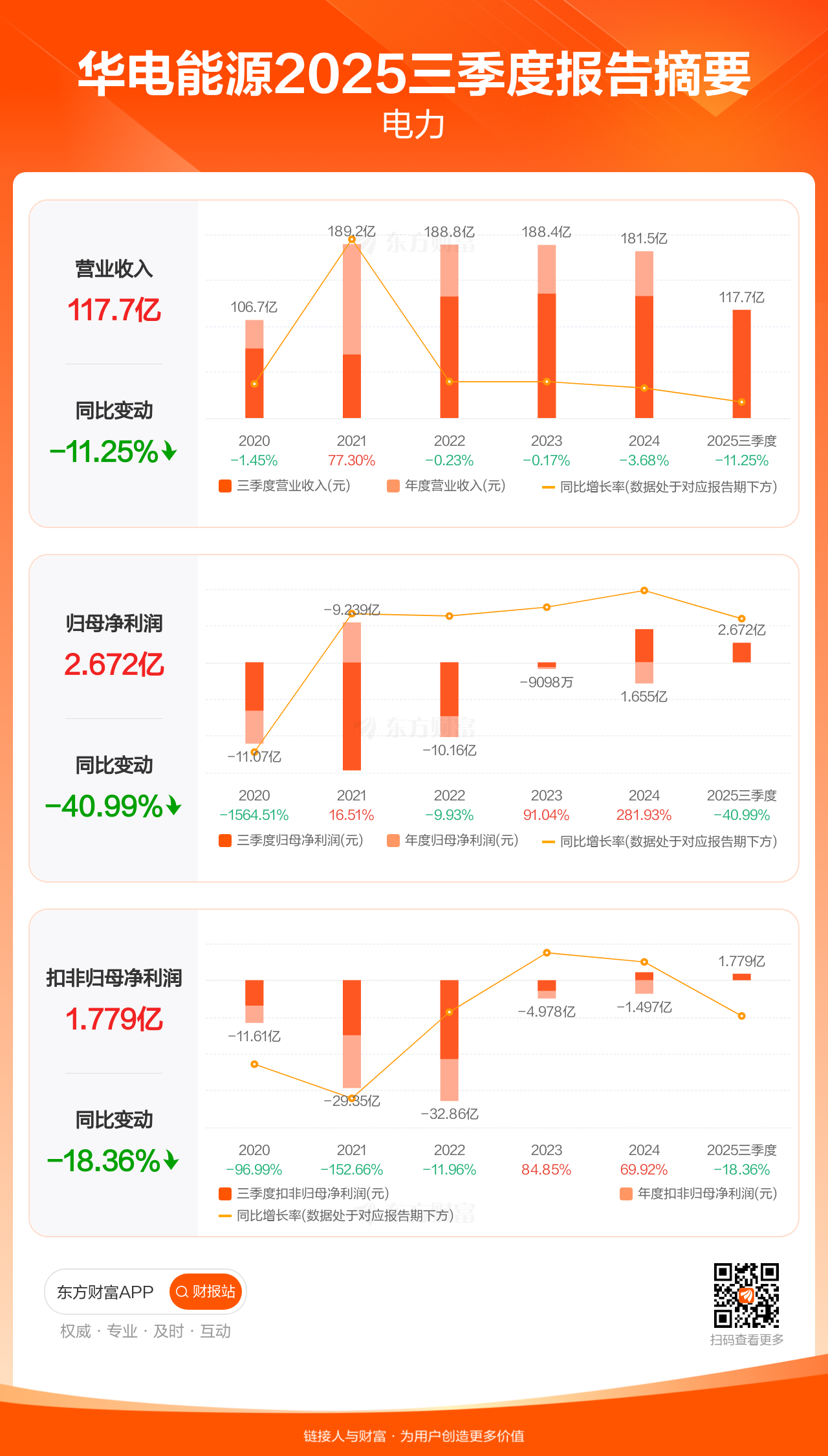 华电能源10月30日发布2025年三季报显示,公司前三季实现营业收入117.75亿元,同比下滑11.25%;归母净利润2.67亿元,同比下滑40.99%;扣非归母净利润1.78亿元,同比下滑18.36%。