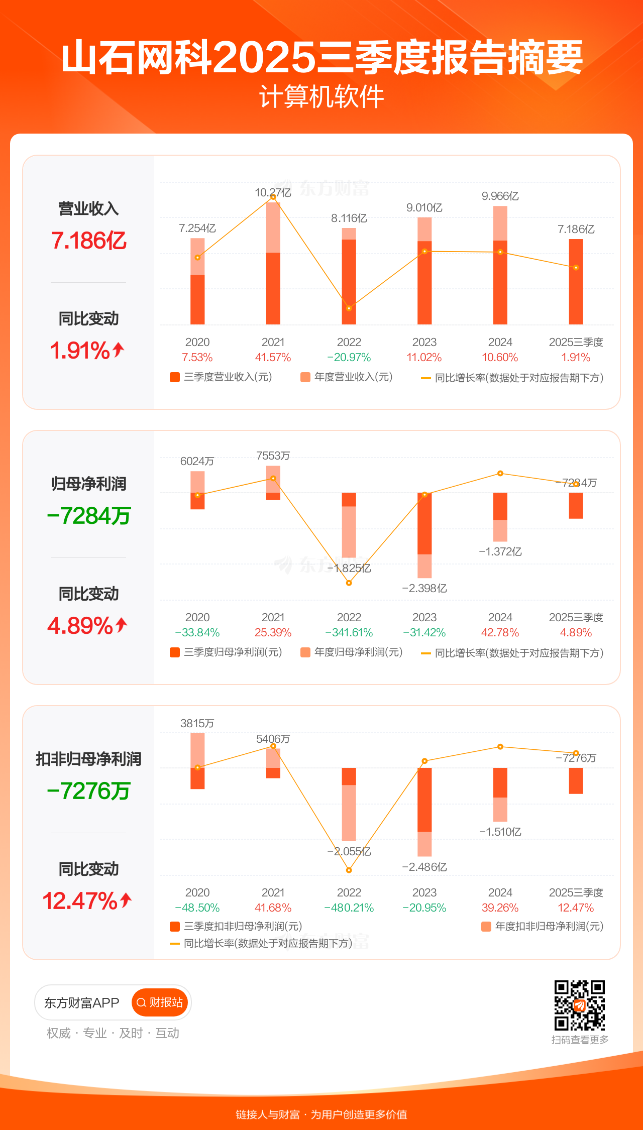 山石网科10月30日发布2025年三季报显示,公司前三季实现营业收入7.19亿元,同比增长1.91%;归母净利润-7283.55万元;扣非归母净利润-7276.32万元。
