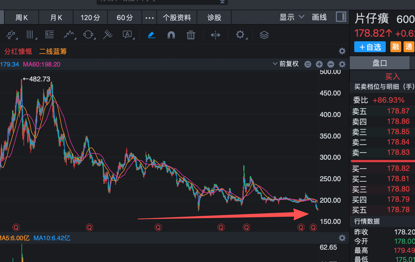 更惨的是片仔癀,这个股票过去4年都在下跌,跌了4年,股价从480跌到180,跌的时间,跌的幅度都是非常大的,更可怕的是最近A股加速上涨,这个股票开始加速下跌了。