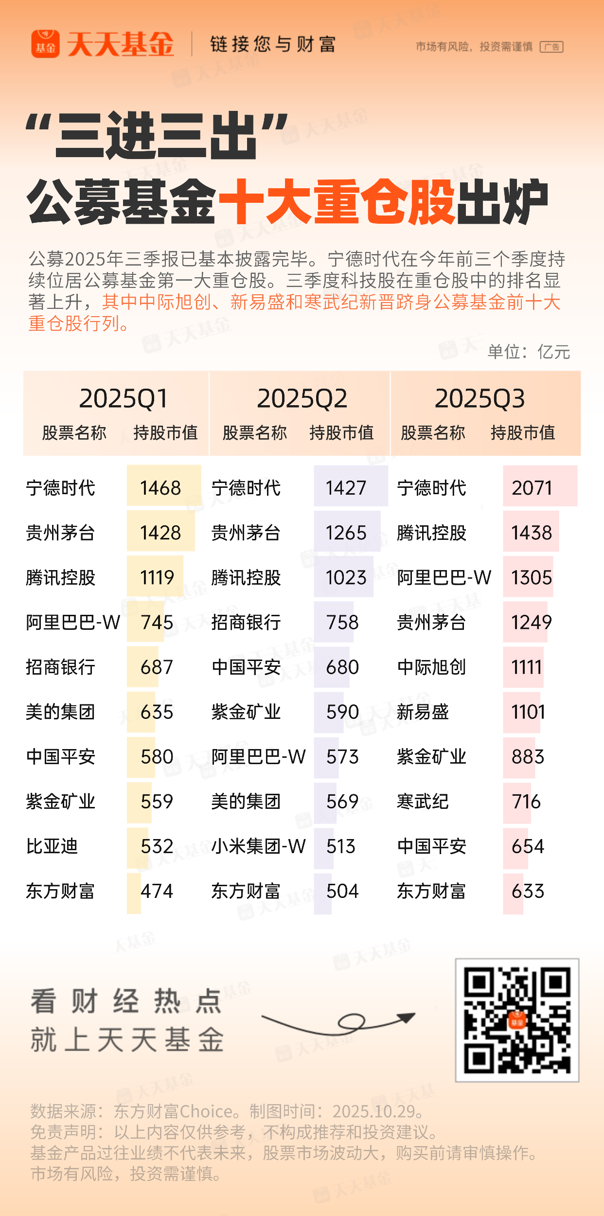 与2025年二季度末相比,中际旭创、新易盛和寒武纪新晋跻身公募基金前十大重仓股行列,招商银行、美的集团、小米集团-W退出前十大重仓股行列。