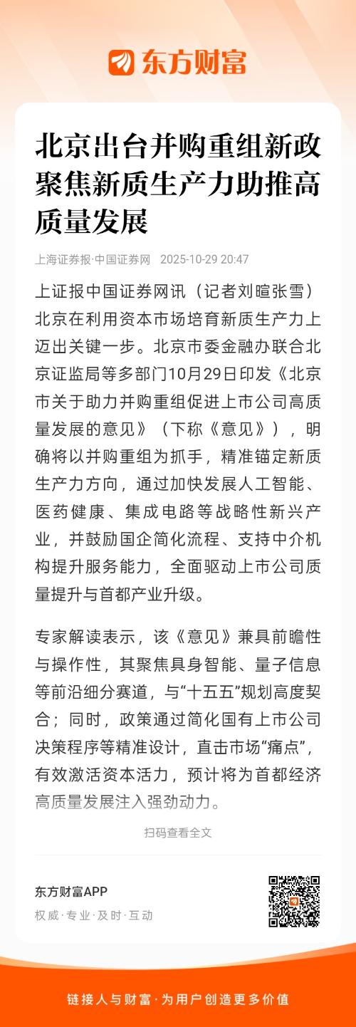 上证报中国证券网讯(记者刘暄张雪)北京在利用资本市场培育新质生产力上迈出关键一步。北京市委金融办联合北京证监局等多部门10月29日印发《北京市关于助力并购重组促进上市公司高质量发展的意见》(下称《意见》),明确将以并购重组为抓手,精准锚定新质生产力方向,通过加快发展人工智能、医药健康、集成电路等战略性新兴产业,并鼓励国企简化流程、支持中介机构提升服务能力,全面驱动上市公司质量提升与首都产业升级。