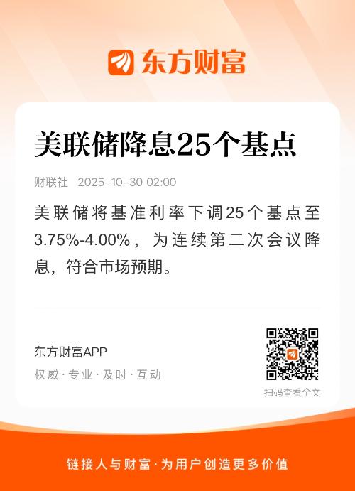 北京时间周四(10月30日)凌晨,美联储结束为期两天的货币政策会议,宣布将联邦基金利率目标区间下调25个基点到3.75%至4.00%之间,符合市场普遍预期。