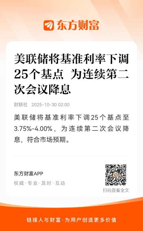 北京时间周四(10月30日)凌晨,美联储结束为期两天的货币政策会议,宣布将联邦基金利率目标区间下调25个基点到3.75%至4.00%之间,符合市场普遍预期。