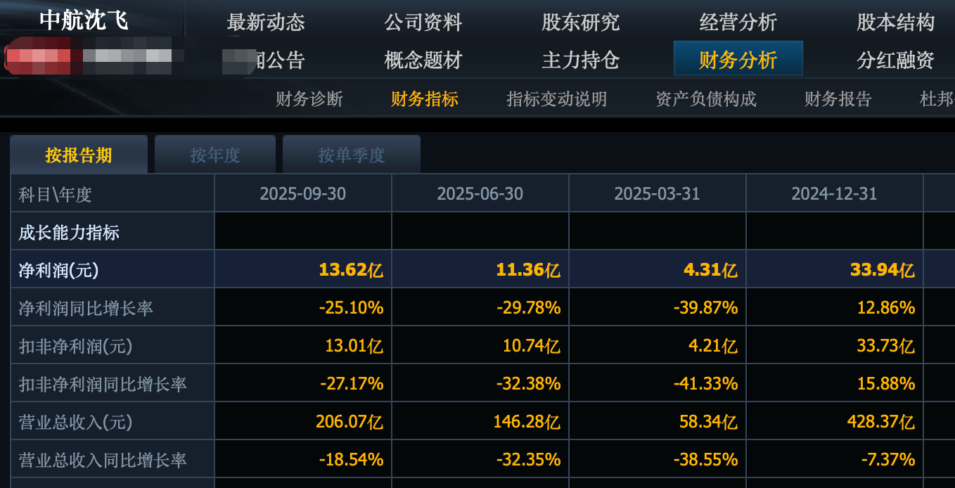 中航沈飞今年前三季度收入下滑19%到206亿元,净利润下滑25%到13.62亿元。