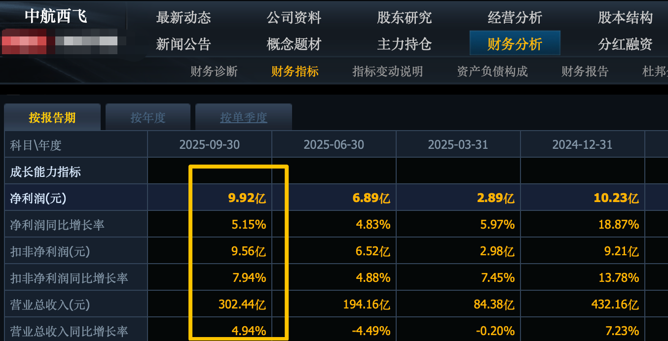 中航西飞今年签三季度收入增长5%到302亿,净利润增长5%到9.92亿元,