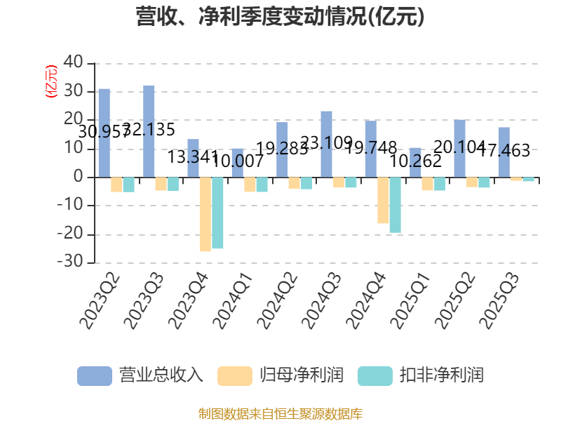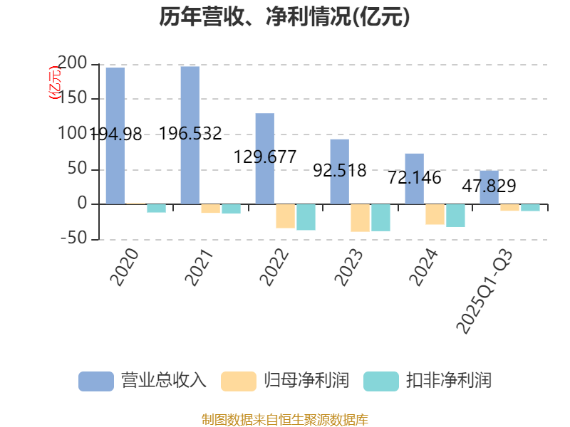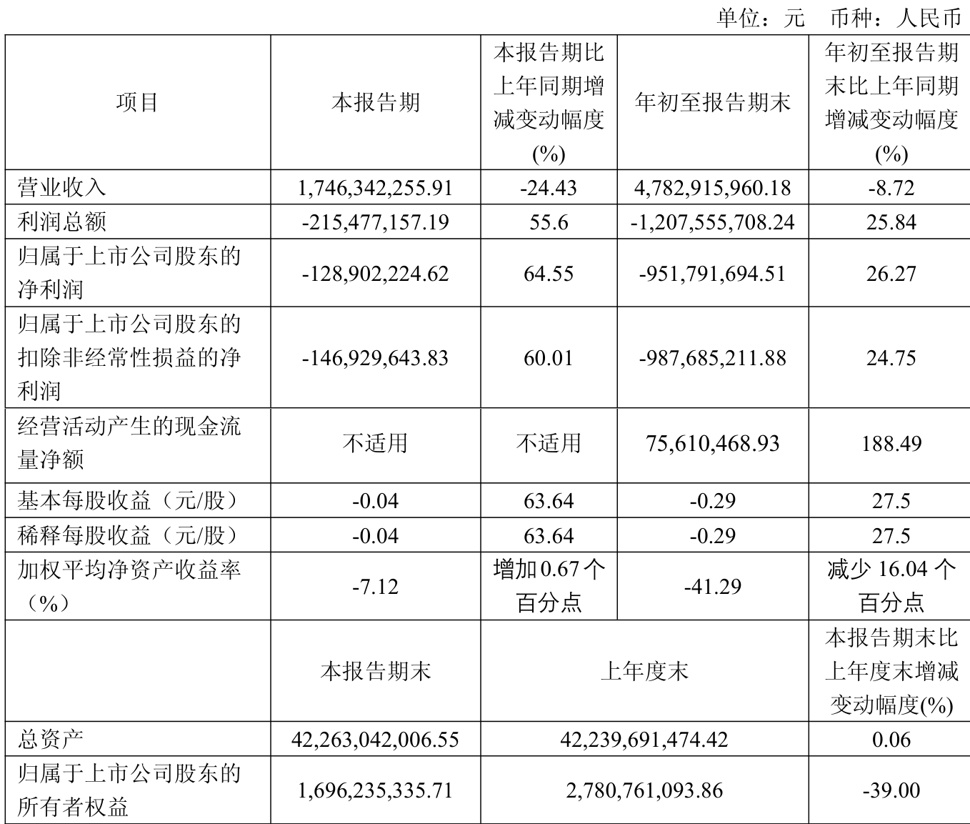 中证智能财讯亚泰集团(600881)10月30日披露2025年第三季度报告。前三季度公司实现营业总收入47.83亿元,同比下降8.72%;归母净利润亏损9.52亿元,上年同期亏损12.91亿元;扣非净利润亏损9.88亿元,上年同期亏损13.13亿元;经营活动产生的现金流量净额为7561.05万元,上年同期为-8544.32万元;报告期内,亚泰集团基本每股收益为-0.29元,加权平均净资产收益率为-41.29%。