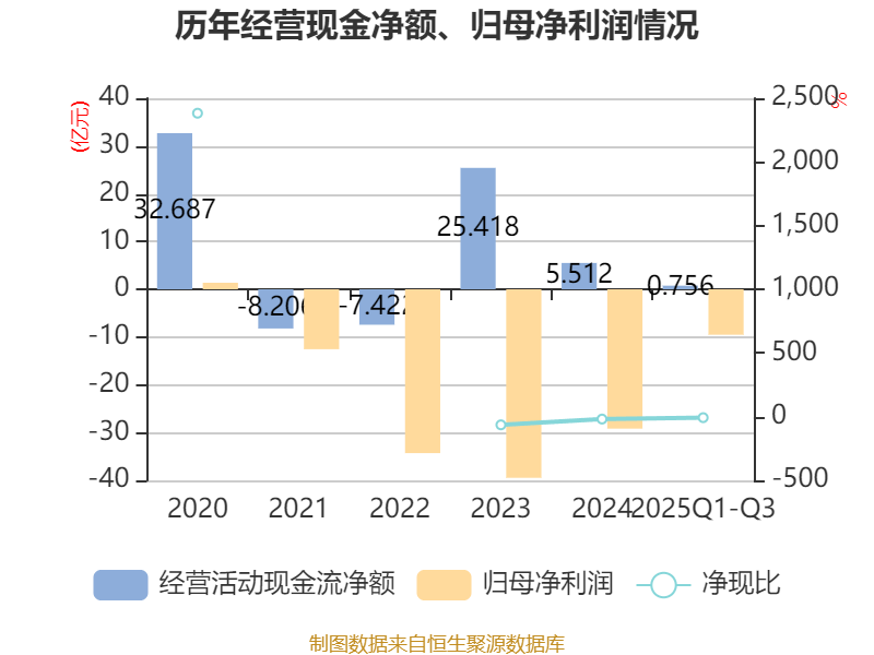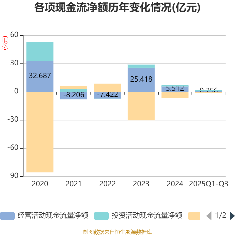 2025年前三季度,公司经营活动现金流净额为7561.05万元,同比增加1.61亿元;筹资活动现金流净额-1.35亿元,同比减少2805.31万元;投资活动现金流净额9363.23万元,上年同期为1.07亿元。