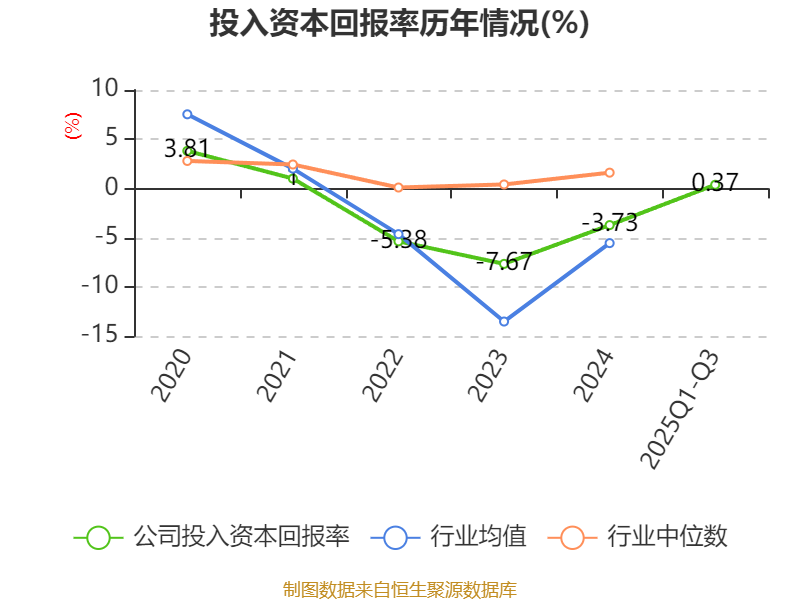 盈利能力方面, 2025年前三季度公司加权平均净资产收益率为-41.29%,同比下降16.04个百分点。公司2025年前三季度投入资本回报率为0.37%,较上年同期上升0.75个百分点。