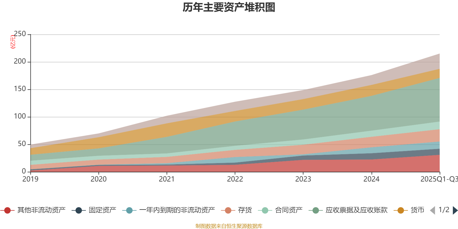 资产重大变化方面,截至2025年三季度末,公司货币资金较上年末减少17.09%,占公司总资产比重下降3.65个百分点;其他非流动资产较上年末增加37.63%,占公司总资产比重上升1.58个百分点;其他应收款(含利息和股利)较上年末增加100.8%,占公司总资产比重上升1.57个百分点;固定资产较上年末减少1.49%,占公司总资产比重下降1.26个百分点。
