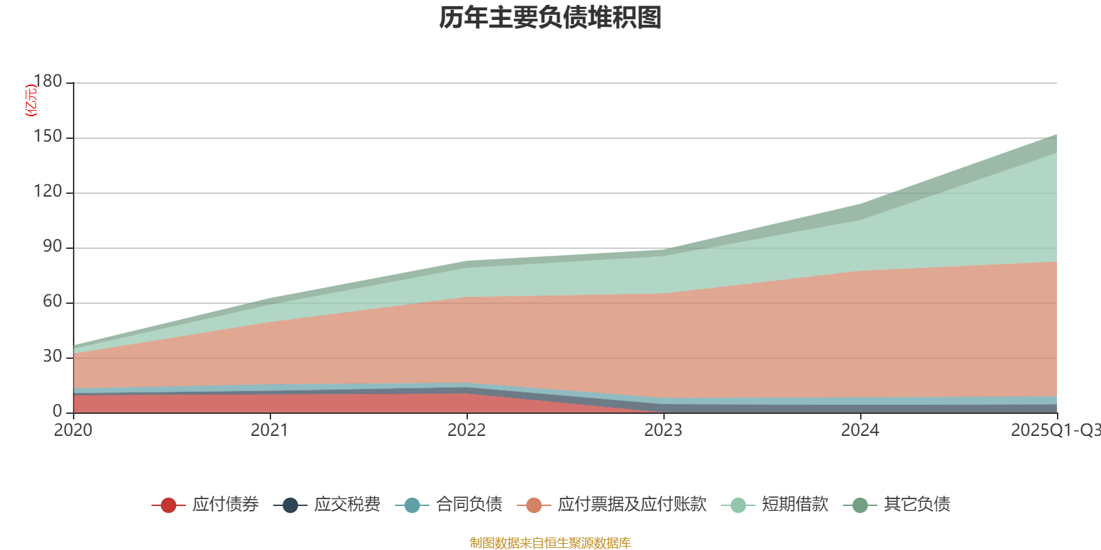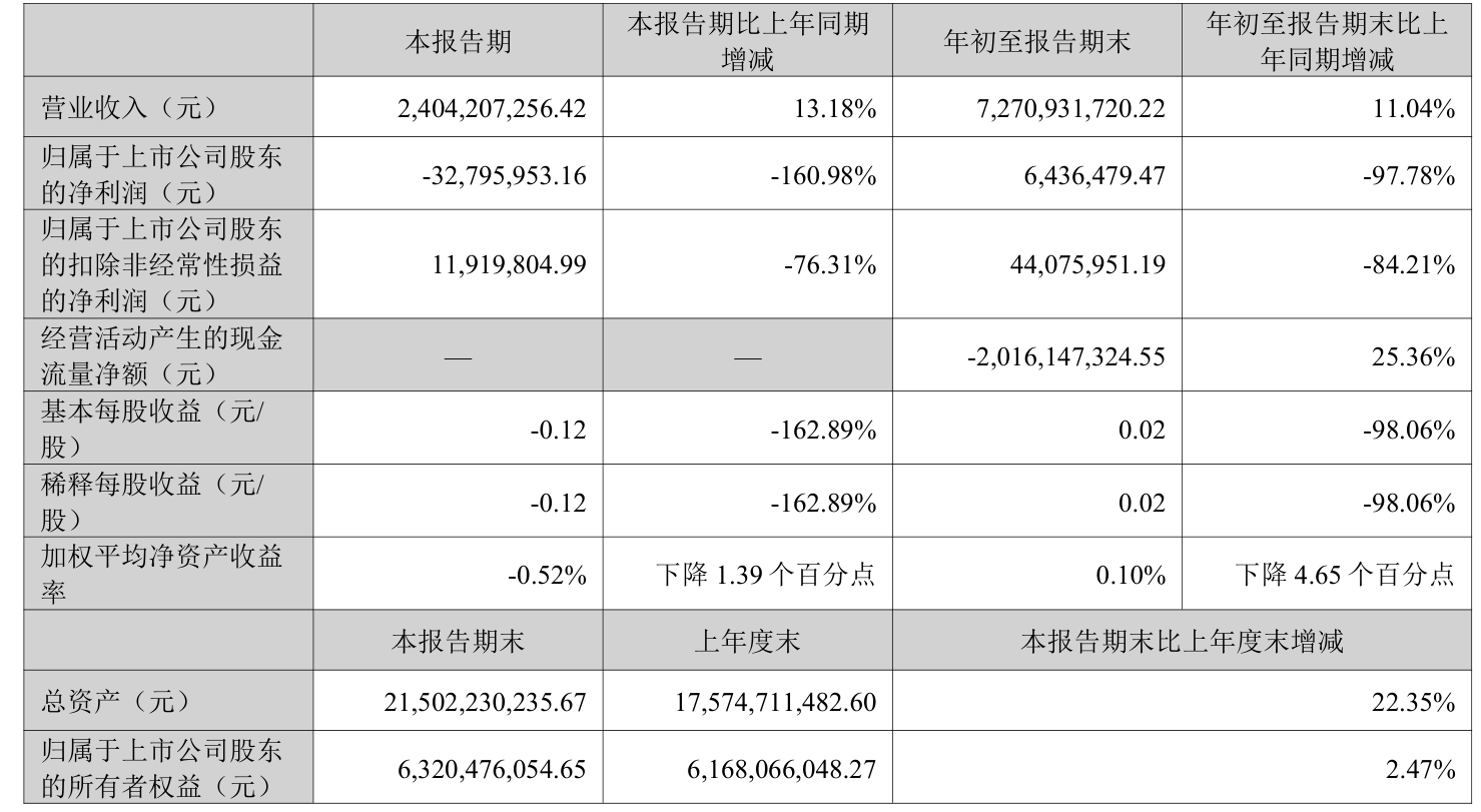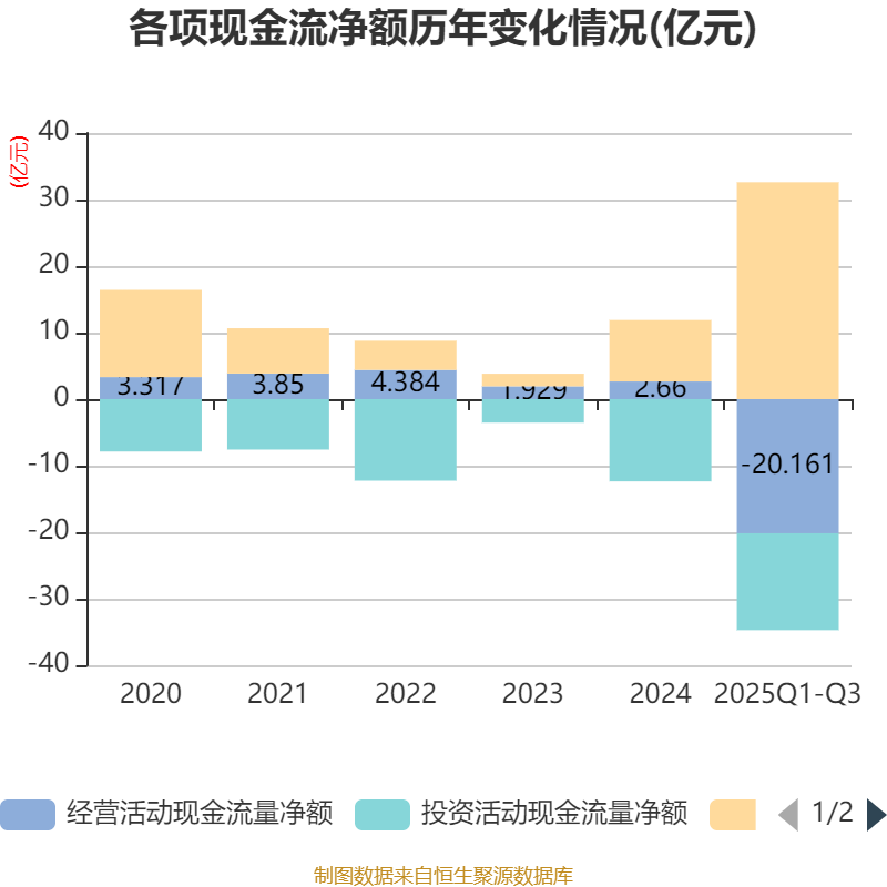 2025年前三季度,公司经营活动现金流净额为-20.16亿元,同比增加6.85亿元;筹资活动现金流净额32.61亿元,同比增加14.63亿元;投资活动现金流净额-14.56亿元,上年同期为-3.99亿元。