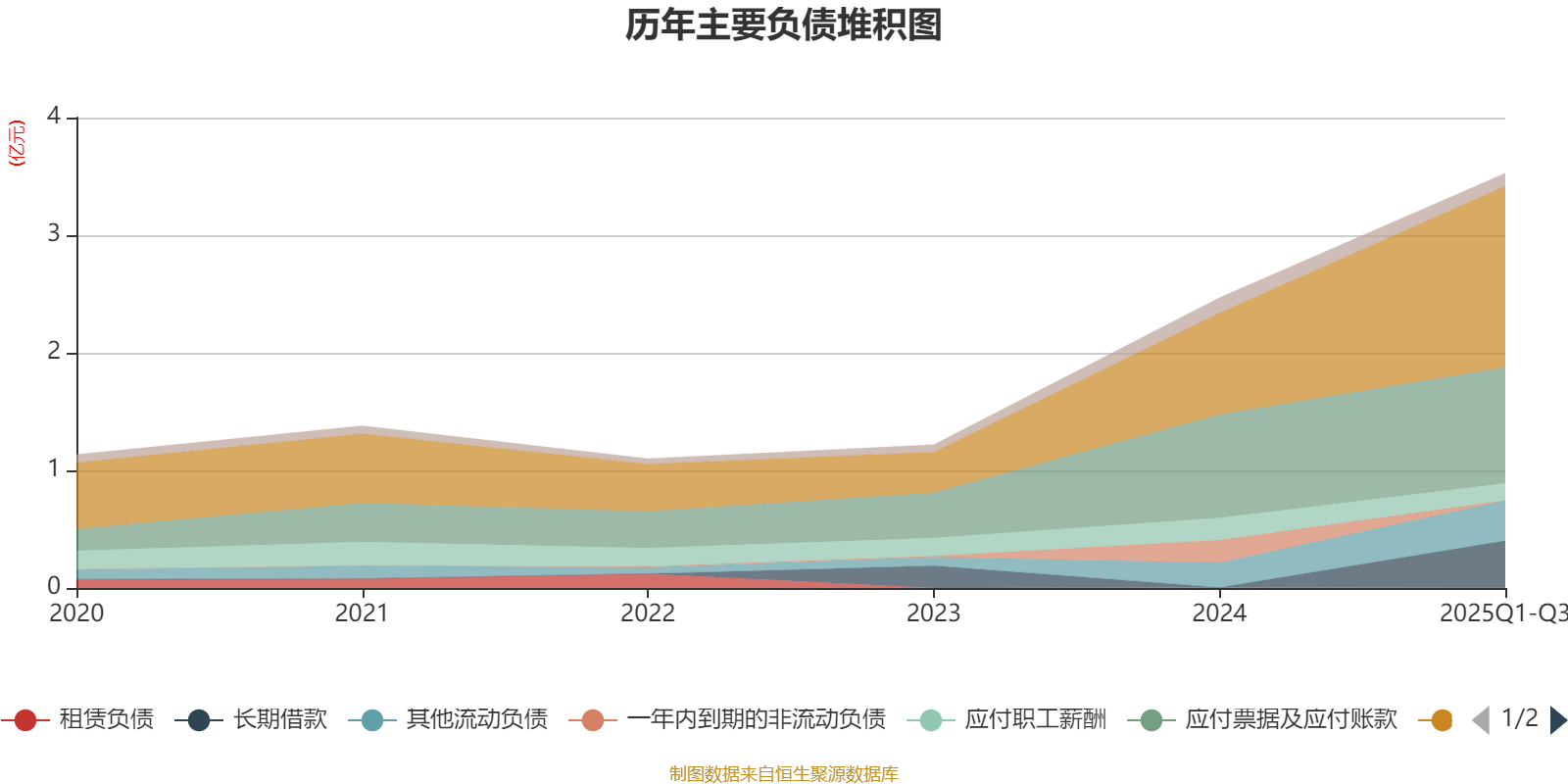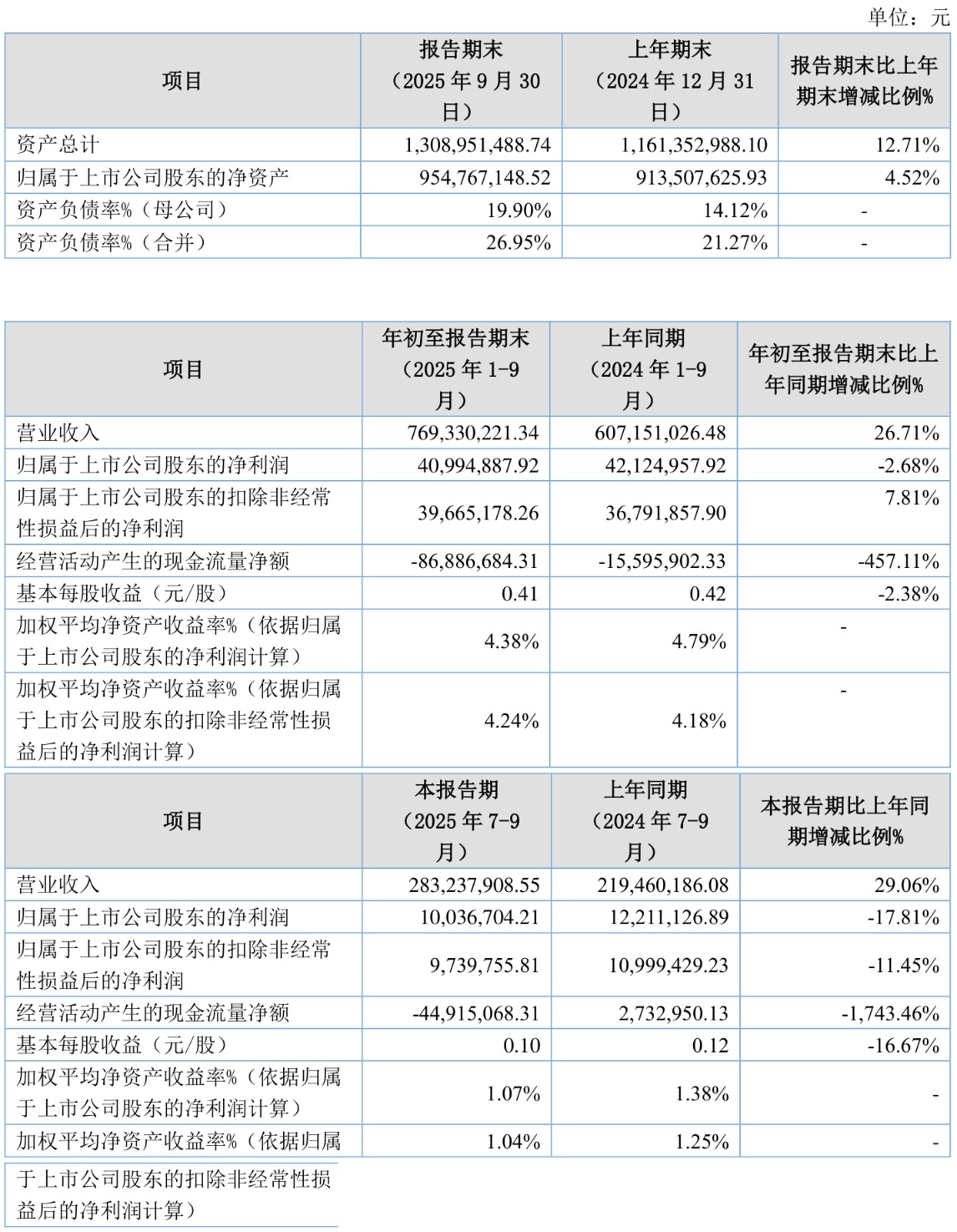 负债重大变化方面,截至2025年三季度末,公司短期借款较上年末增加78.56%,占公司总资产比重上升4.34个百分点;长期借款占公司总资产的3.06%,上年末为0;一年内到期的非流动负债较上年末减少98.88%,占公司总资产比重下降1.67个百分点;其他流动负债较上年末增加62.44%,占公司总资产比重上升0.8个百分点。