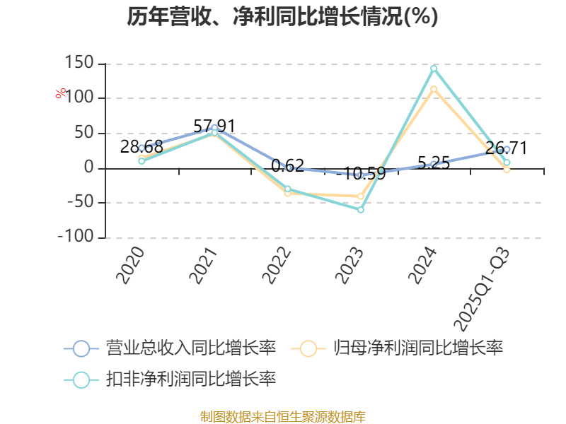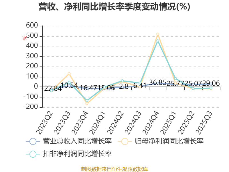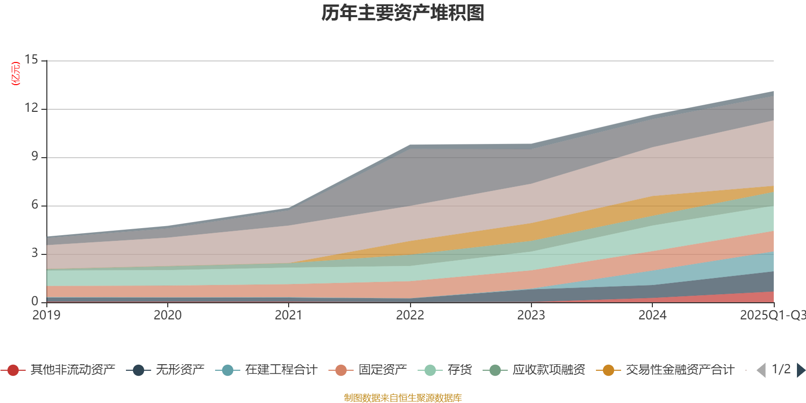 资产重大变化方面,截至2025年三季度末,公司交易性金融资产合计较上年末减少69.1%,占公司总资产比重下降7.69个百分点;应收票据及应收账款较上年末增加34.02%,占公司总资产比重上升4.94个百分点;货币资金较上年末减少13.05%,占公司总资产比重下降3.43个百分点;其他非流动资产较上年末增加148.54%,占公司总资产比重上升2.76个百分点。