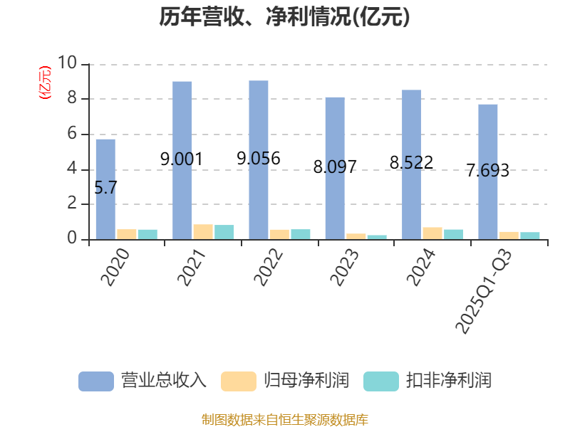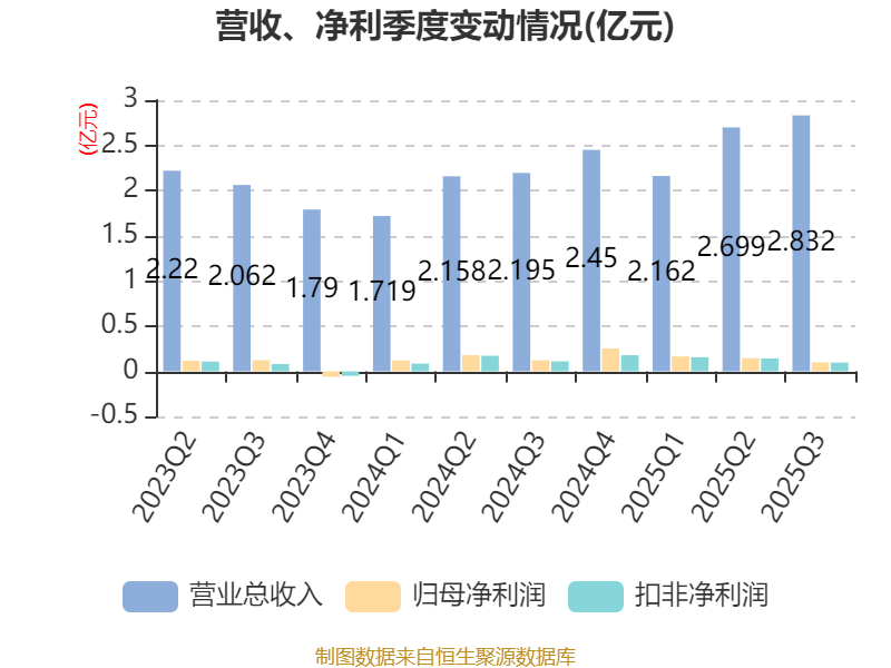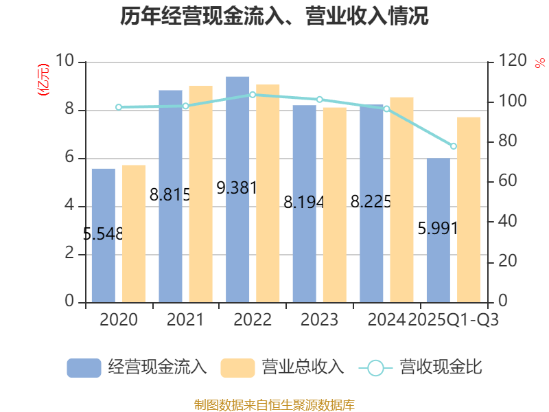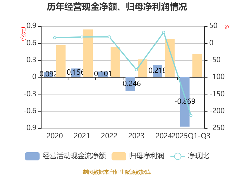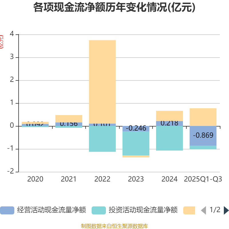 2025年前三季度,公司经营活动现金流净额为-8688.67万元,同比减少7129.08万元;筹资活动现金流净额7725.71万元,同比增加3321.59万元;投资活动现金流净额-1432.21万元,上年同期为-6999.28万元。