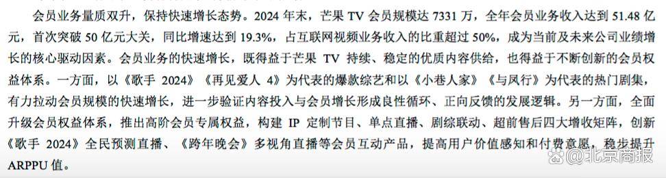 上述报告还提及,会员业务的快速增长,既得益于芒果TV持续、稳定的优质内容供给,也得益于不断创新的会员权益体系。一方面,以《歌手2024》《再见爱人4》为代表的爆款综艺和以《小巷人家》《与凤行》为代表的热门剧集, 有力拉动会员规模的快速增长;另一方面,全面升级会员权益体系,推出高阶会员专属权益,构建IP定制节目、单点直播、剧综联动、超前售后四大增收矩阵,创新《歌手2024》全民预测直播、《跨年晚会》多视角直播等会员互动产品,提高用户价值感知和付费意愿,稳步提升ARPPU值。