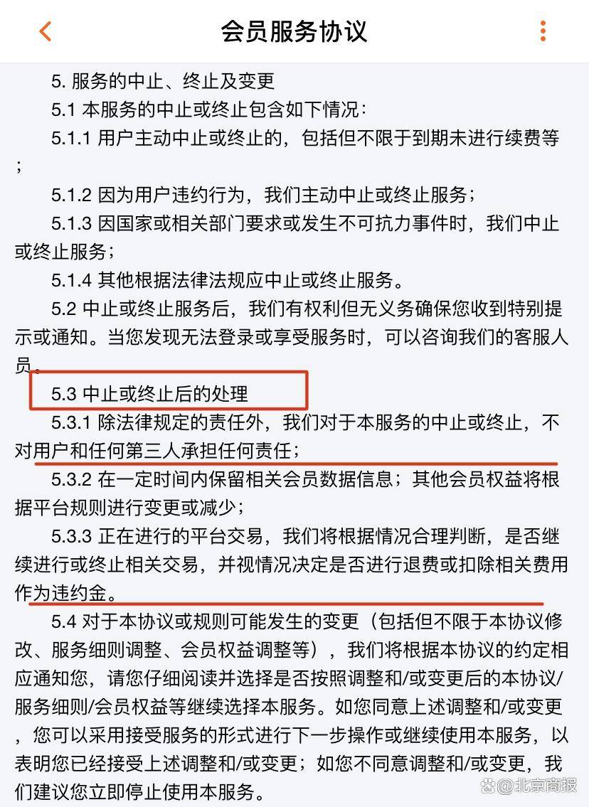 据芒果TV《会员服务协议》(以下简称《协议》),在“服务的中止、终止及变更”部分的“中止或终止后的处理”提及,除法律规定的责任外,平台对于服务中止或终止,不对用户和任何第三人承担任何责任;正在进行的平台交易,将根据情况合理判断,是否继续进行或终止相关交易,并视情况决定是否进行退费或扣除相关费用作为违约金。