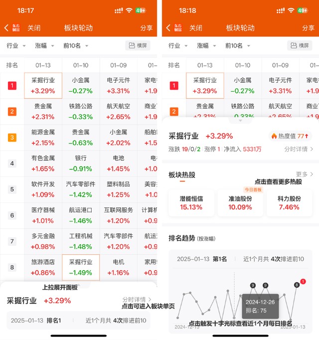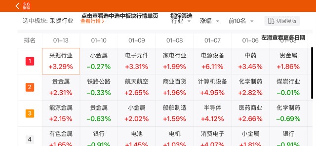 板块轮动明细:点击某一只板块,将红框标识出表格中全部的这只板块,下方小面板可以上拉,进行更详细的复盘