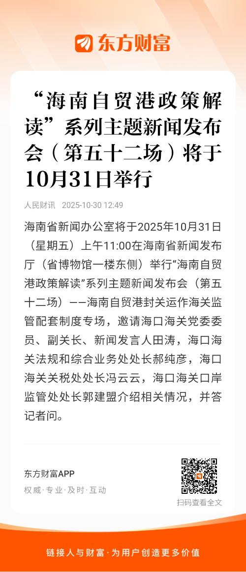 海南省新闻办公室将于2025年10月31日(星期五)上午11:00在海南省新闻发布厅(省博物馆一楼东侧)举行“海南自贸港政策解读”系列主题新闻发布会(第五十二场)——海南自贸港封关运作海关监管配套制度专场,邀请海口海关党委委员、副关长、新闻发言人田涛,海口海关法规和综合业务处处长郝纯彦,海口海关关税处处长冯云云,海口海关口岸监管处处长郭建盟介绍相关情况,并答记者问。