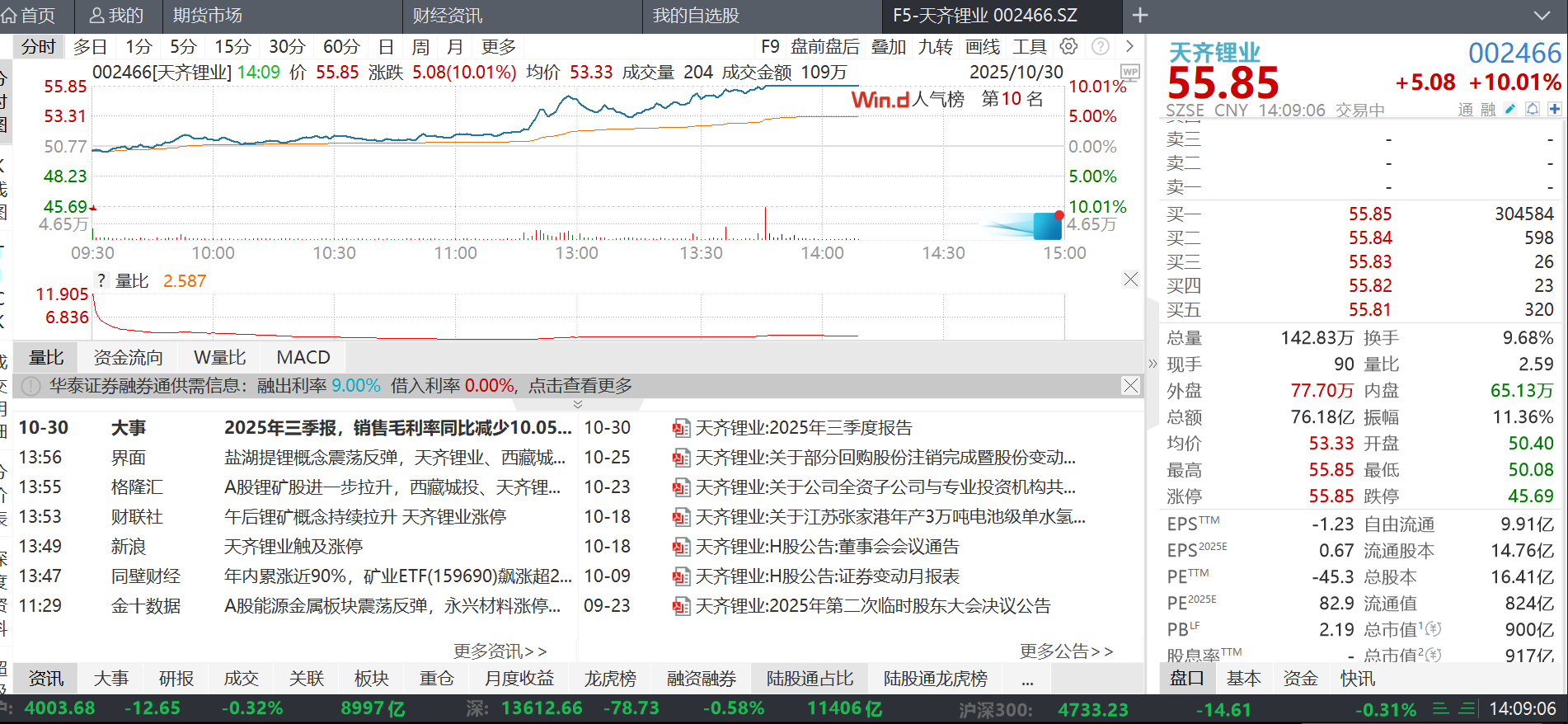 天齐锂业涨停!早上发信息时候涨幅还不到1%。期货市场股票市场联动,一鱼多吃!关注我,投资不迷路