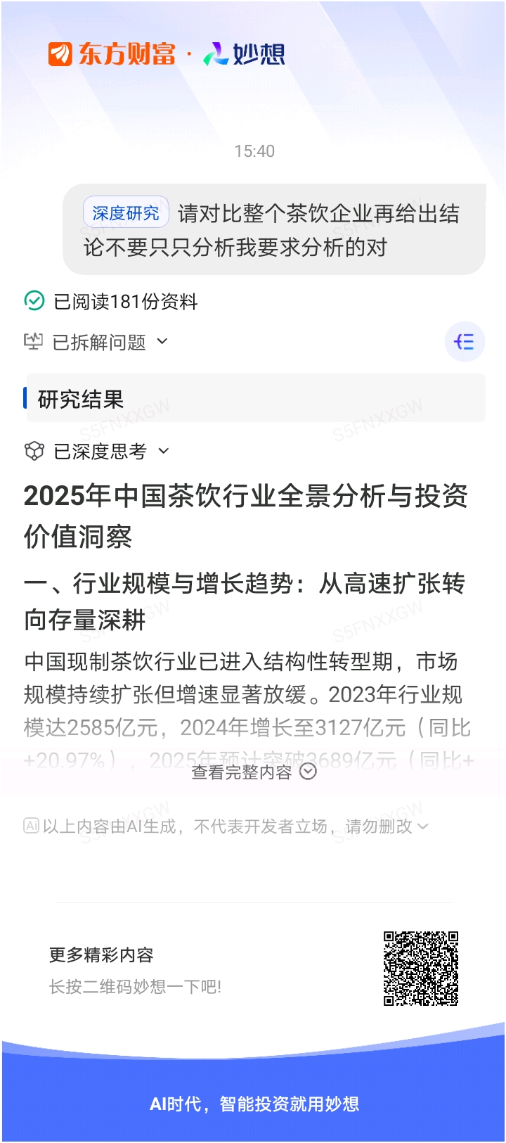 #@妙想,你怎么看?# 妙想一下:请对比整个茶饮企业再给出结论: