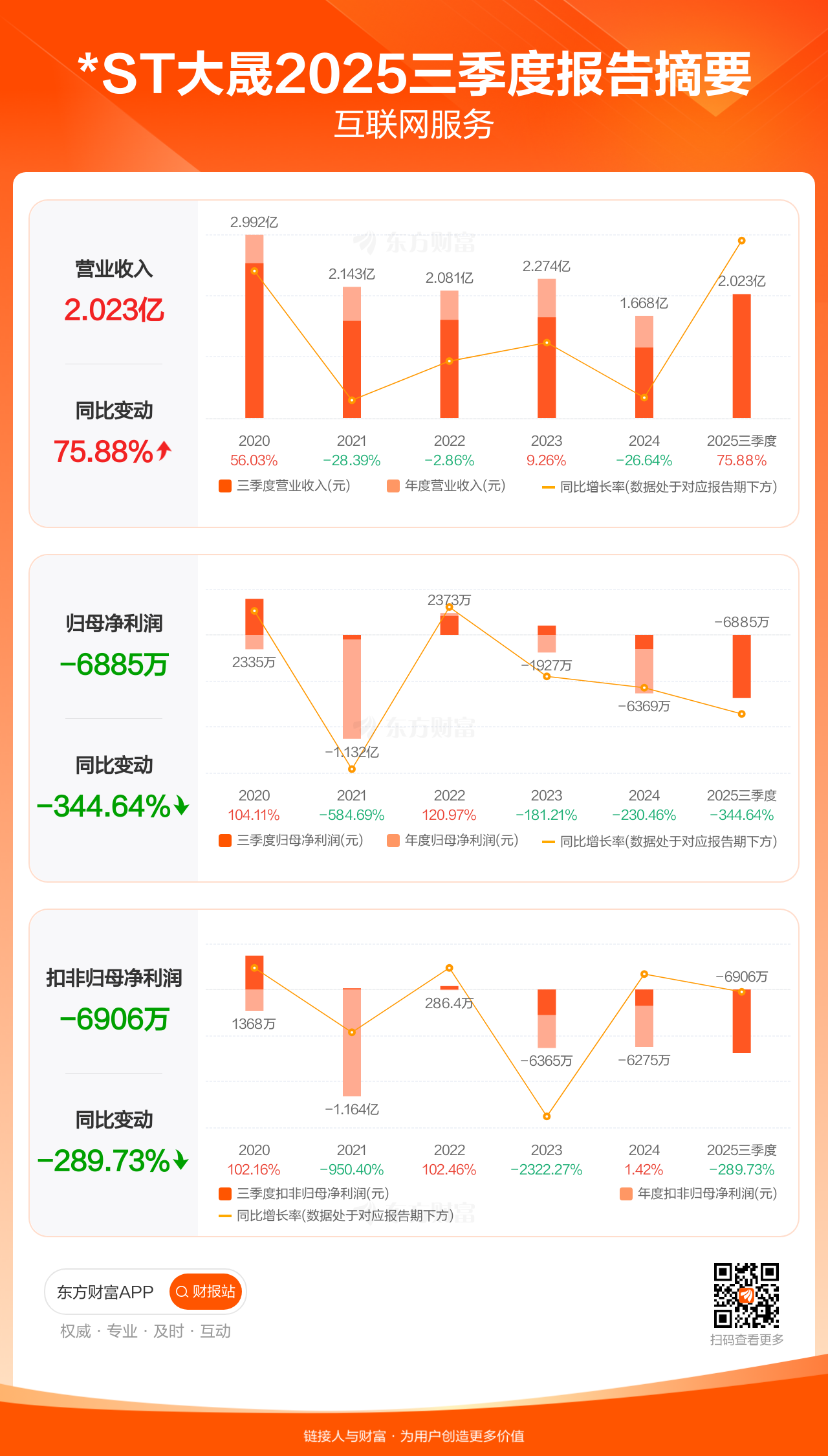 *ST大晟10月31日发布2025年三季报显示,公司前三季实现营业收入2.02亿元,同比增长75.88%;归母净利润-6885.13万元;扣非归母净利润-6906.33万元。
