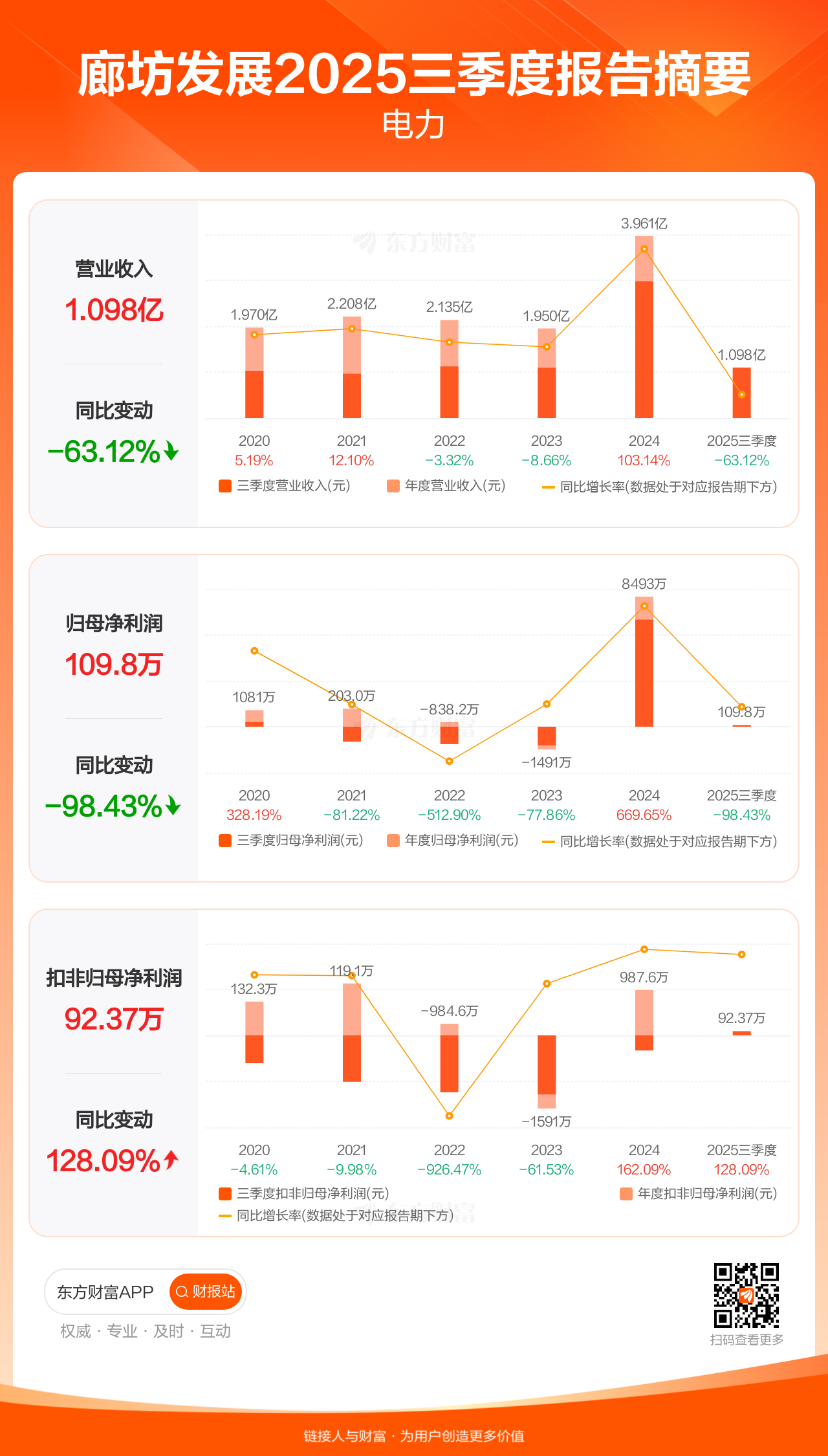 廊坊发展10月31日发布2025年三季报显示,公司前三季实现营业收入1.10亿元,同比下滑63.12%;归母净利润109.78万元,同比下滑98.43%;扣非归母净利润92.37万元,同比增长128.09%。
