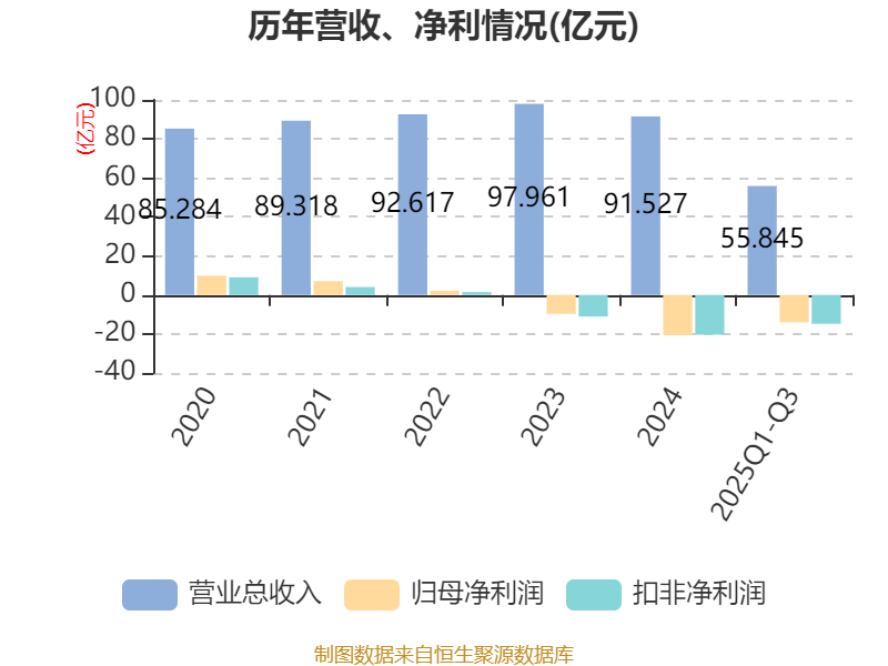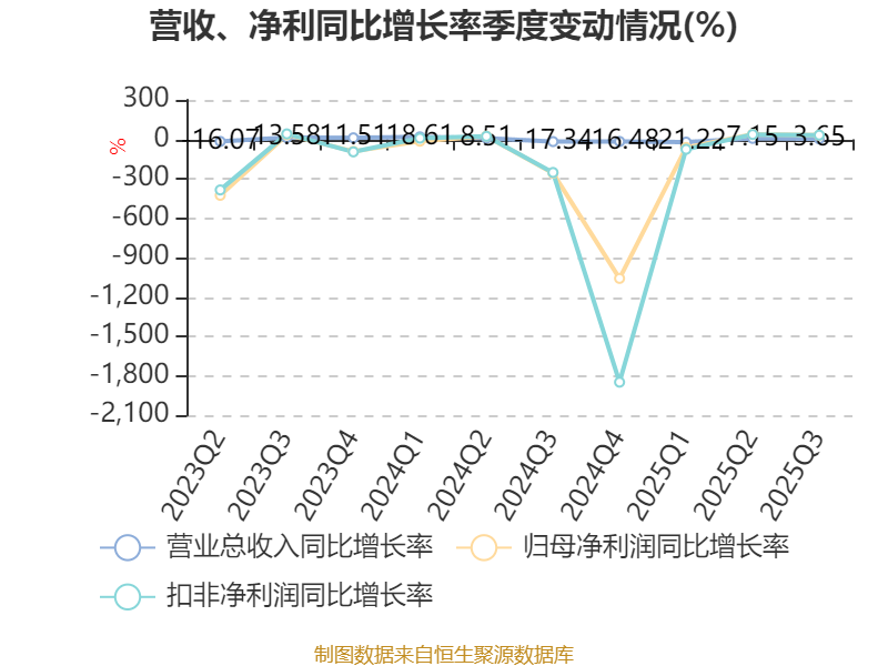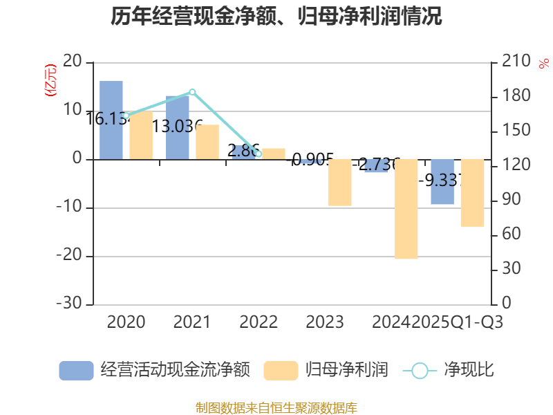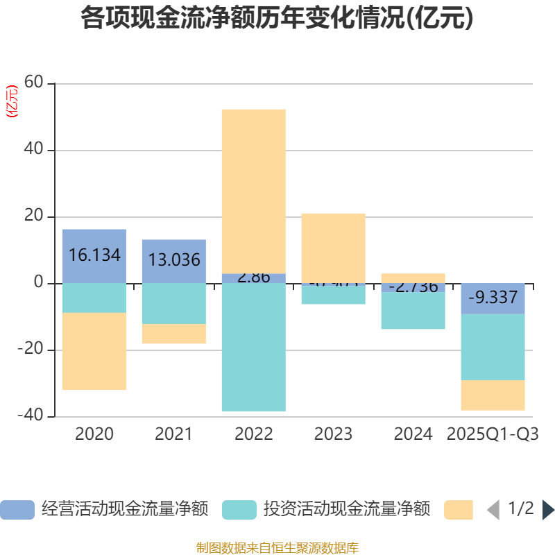 2025年前三季度,公司经营活动现金流净额为-9.34亿元,同比增加11.12亿元;筹资活动现金流净额-9.07亿元,同比减少10.57亿元;投资活动现金流净额-19.85亿元,上年同期为-22.44亿元。