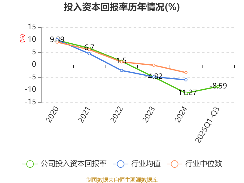 盈利能力方面, 2025年前三季度公司加权平均净资产收益率为-19%,同比下降3.22个百分点。公司2025年前三季度投入资本回报率为-8.59%,较上年同期下降0.6个百分点。