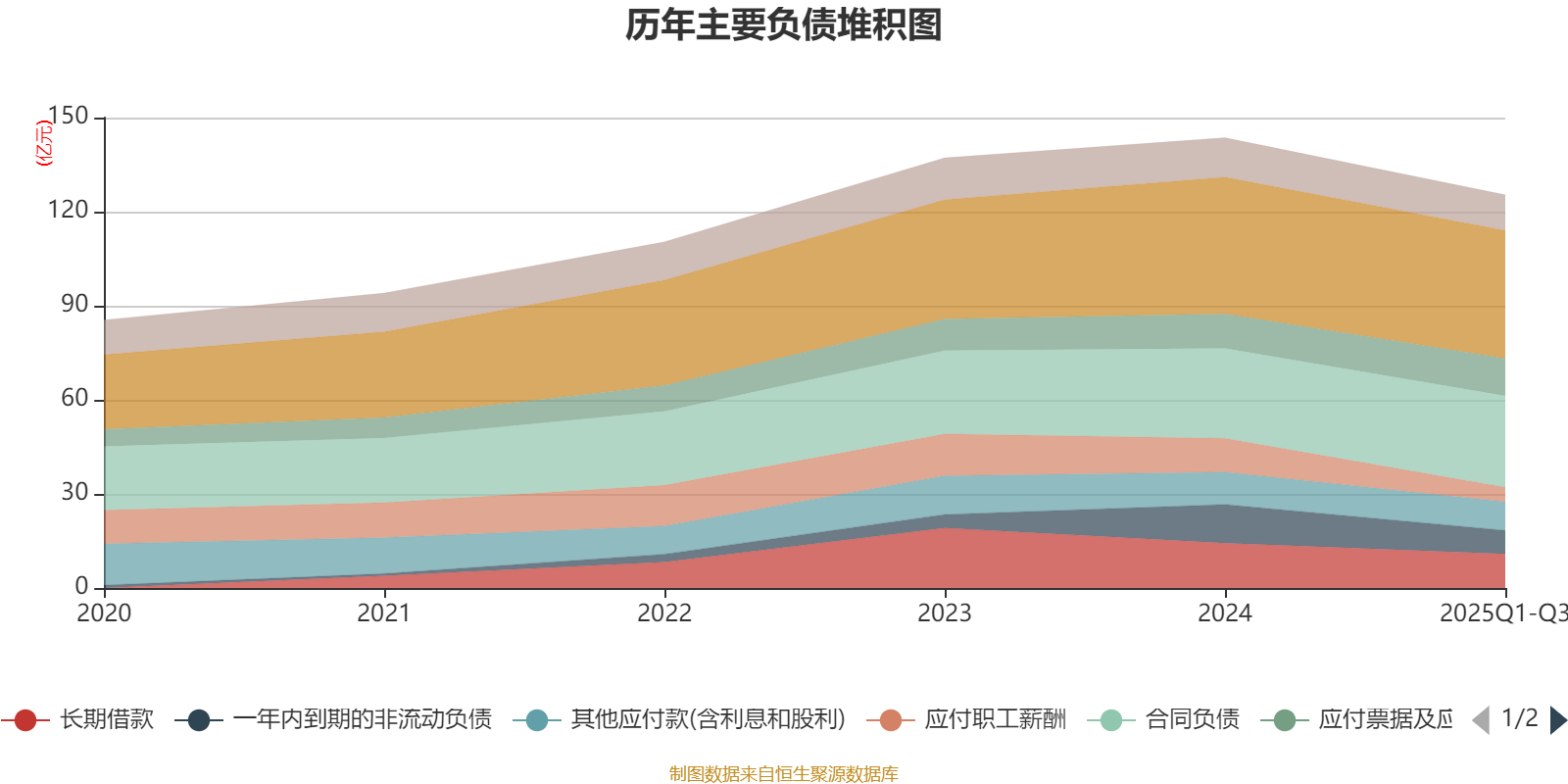 负债重大变化方面,截至2025年三季度末,公司应付职工薪酬较上年末减少56.77%,占公司总资产比重下降2.29个百分点;合同负债较上年末增加1.6%,占公司总资产比重上升1.68个百分点;一年内到期的非流动负债较上年末减少39.12%,占公司总资产比重下降1.61个百分点;应付票据及应付账款较上年末增加8.57%,占公司总资产比重上升1个百分点。