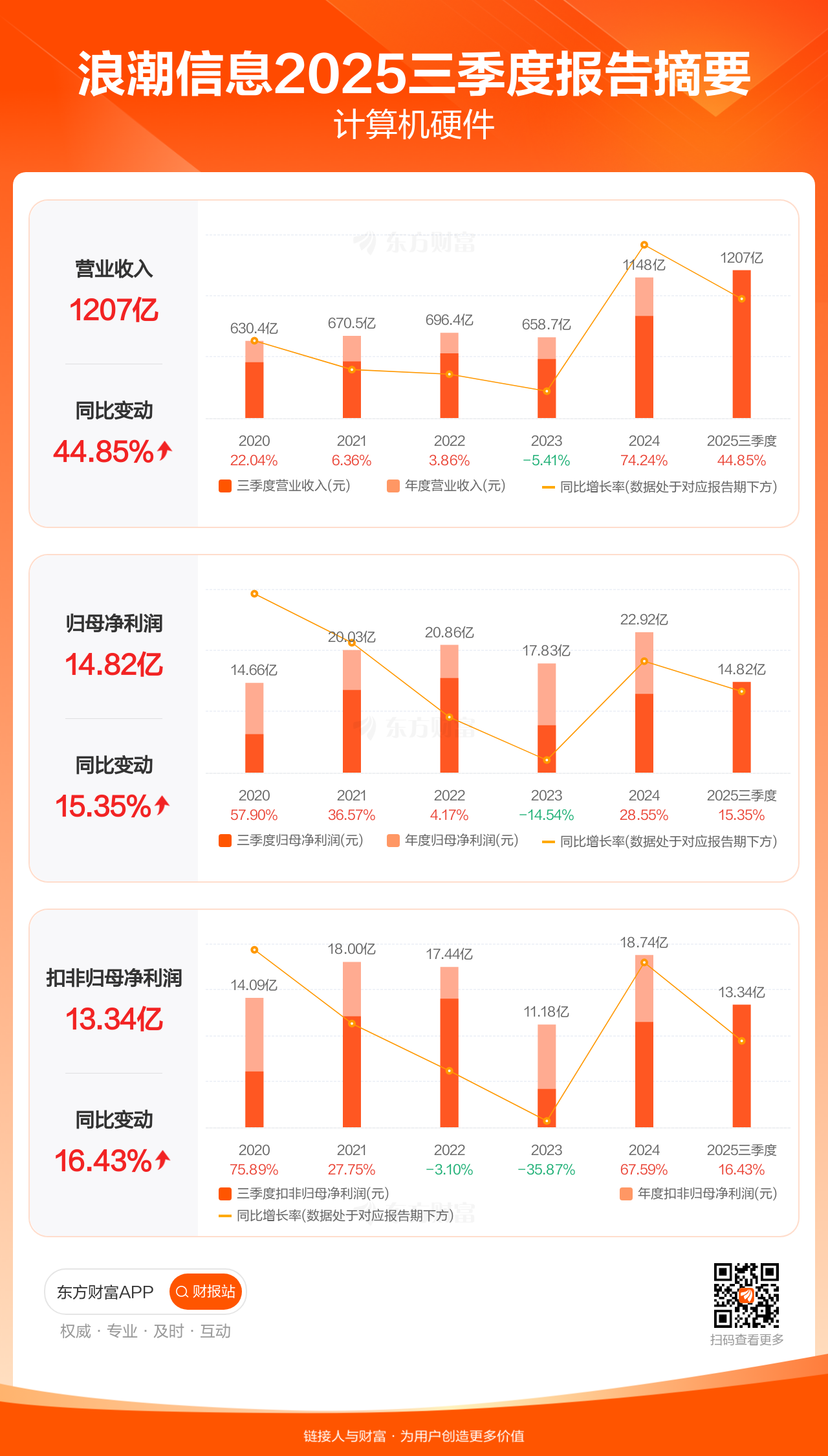 浪潮信息10月31日发布2025年三季报显示,公司前三季实现营业收入1206.69亿元,同比增长44.85%;归母净利润14.82亿元,同比增长15.35%;扣非归母净利润13.34亿元,同比增长16.43%。