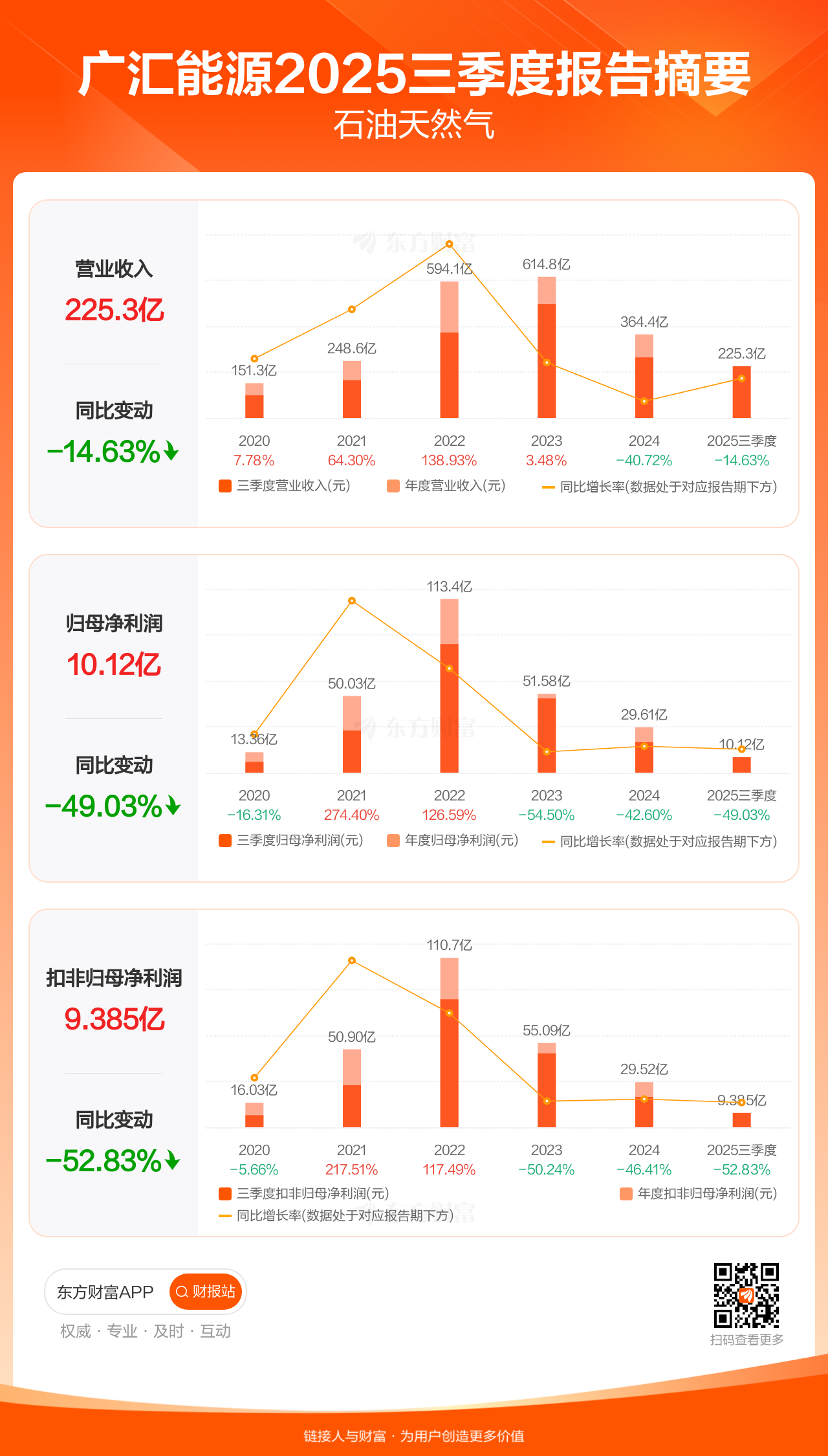 广汇能源10月31日发布2025年三季报显示,公司前三季实现营业收入225.30亿元,同比下滑14.63%;归母净利润10.12亿元,同比下滑49.03%;扣非归母净利润9.38亿元,同比下滑52.83%。