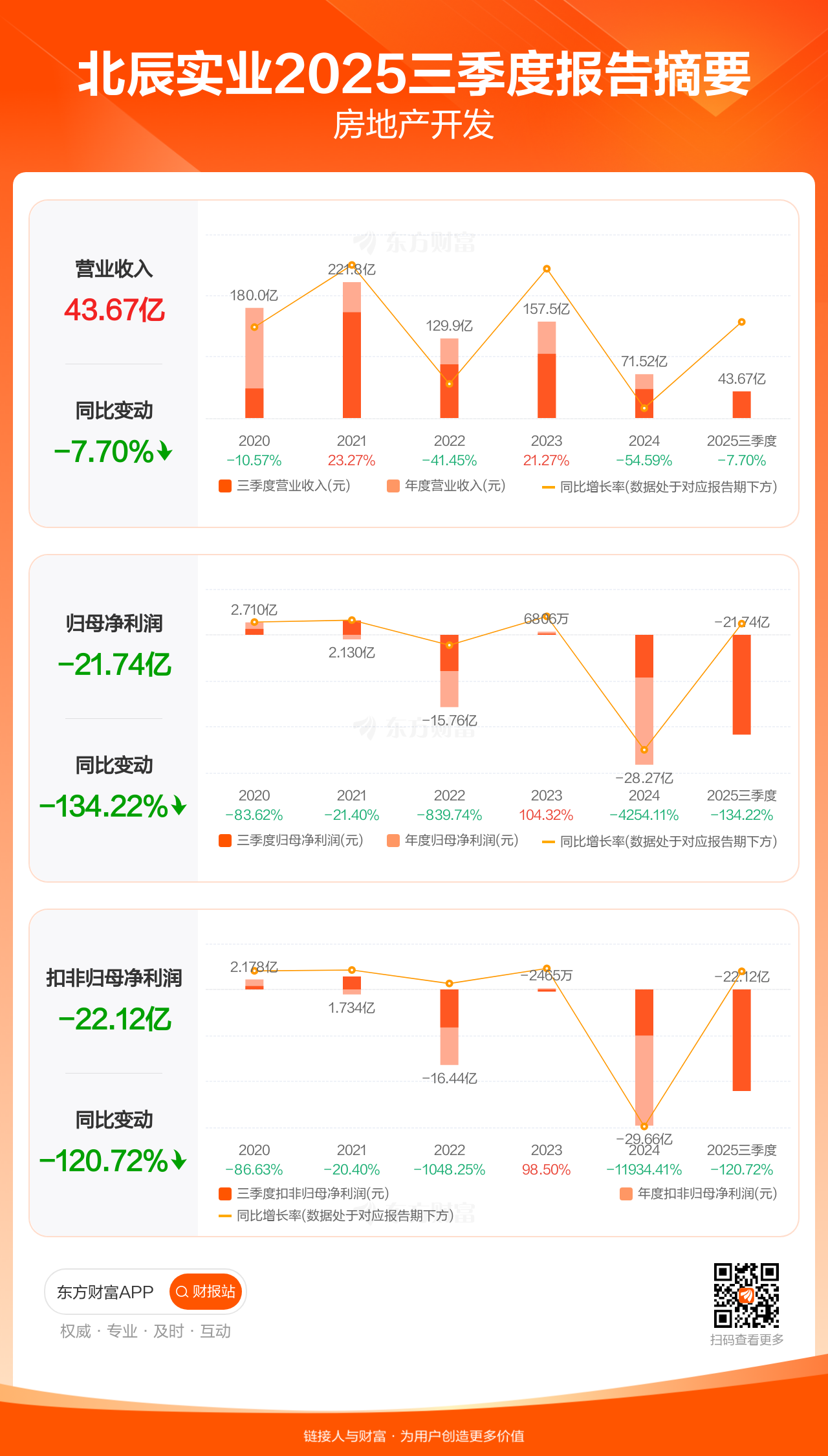 北辰实业10月31日发布2025年三季报显示,公司前三季实现营业收入43.67亿元,同比下滑7.70%;归母净利润-21.74亿元;扣非归母净利润-22.12亿元。