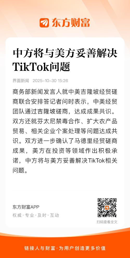 商务部新闻发言人就中美吉隆坡经贸磋商联合安排答记者问时表示,中美经贸团队通过吉隆坡磋商,达成成果共识。双方还就芬太尼禁毒合作、扩大农产品贸易、相关企业个案处理等问题达成共识。双方进一步确认了马德里经贸磋商成果,美方在投资等领域作出积极承诺,中方将与美方妥善解决TikTok相关问题。