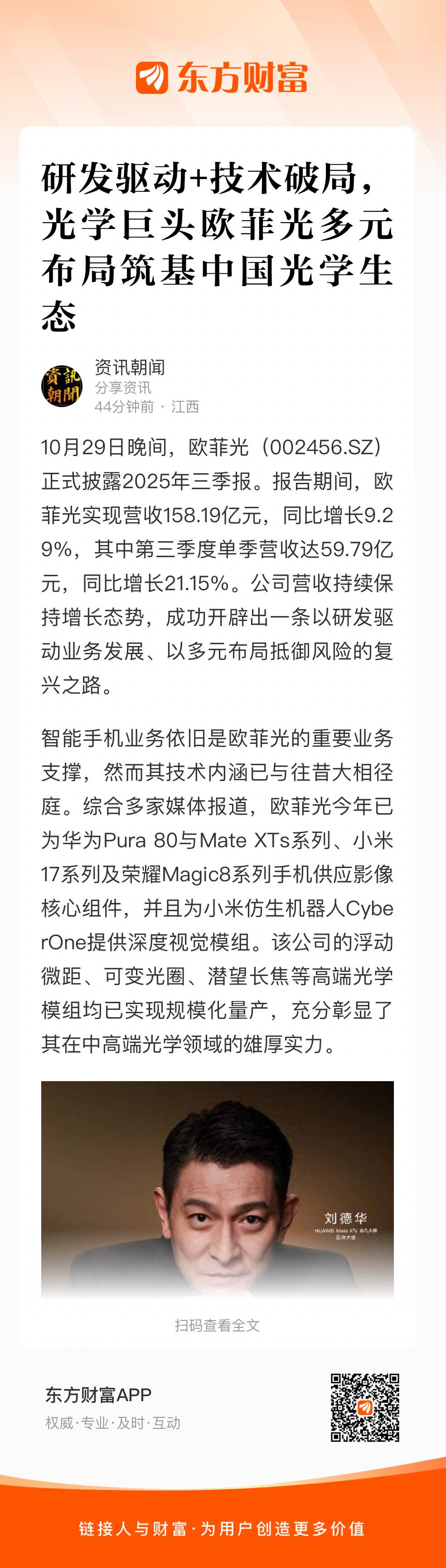 $欧菲光(SZ002456)$#欧菲光:进入国内主流手机厂商镜头供应链##欧菲光:与华为有合作#