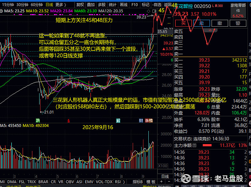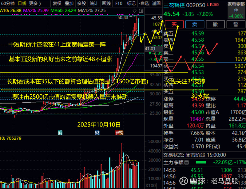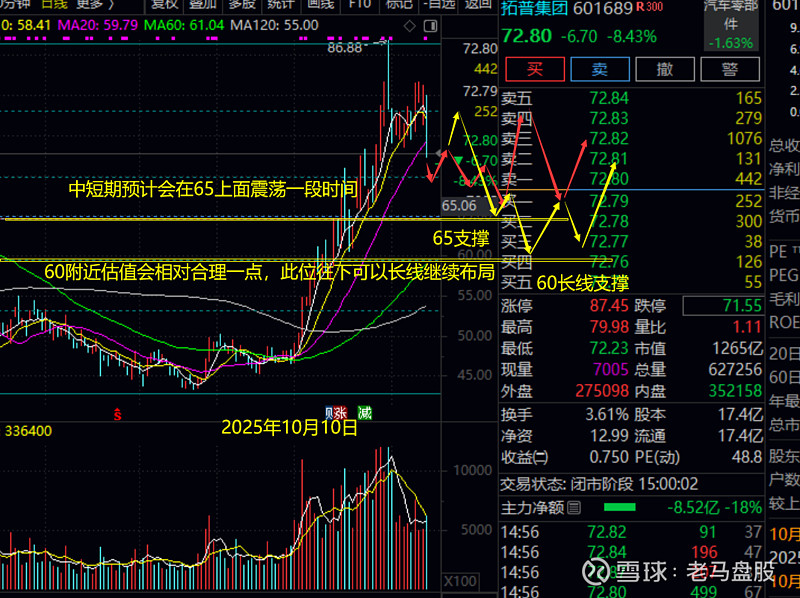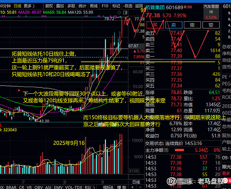 今天市场轮动到机器人了,$拓普集团(SH601689)$ 今天补涨一波,$三花智控(SZ002050)$ 已经新高,走势比较稳。但是拓普离前高还有段距离,要突破87和91这两个大压力有点难,进入80上面适当减了,后面大回踩再来