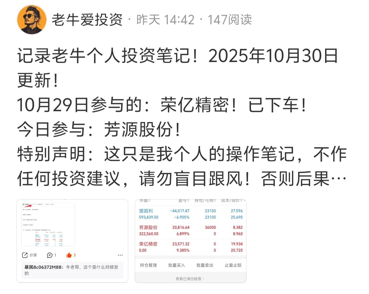 记录老牛个人投资笔记!2025年10月31日更新!盟固利继续没动!10月30日参