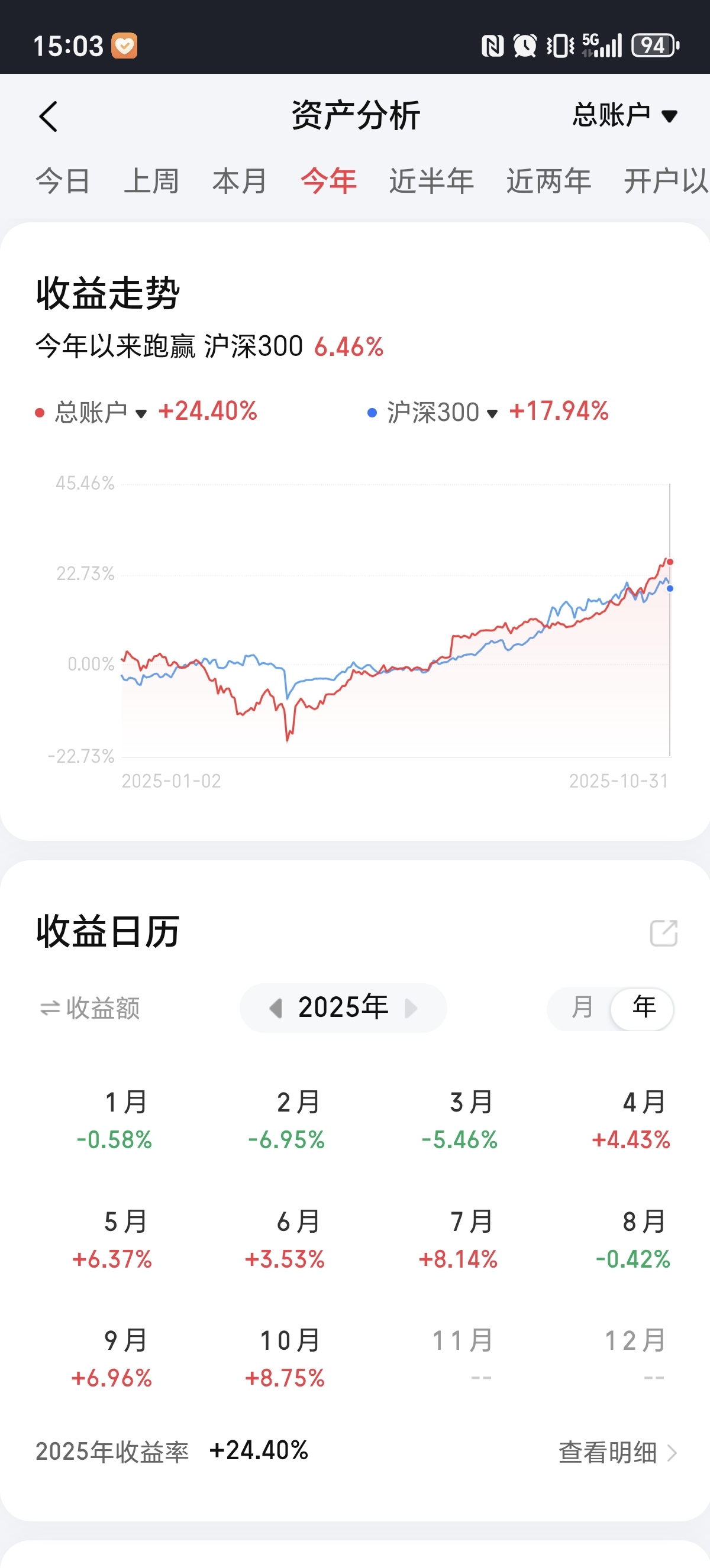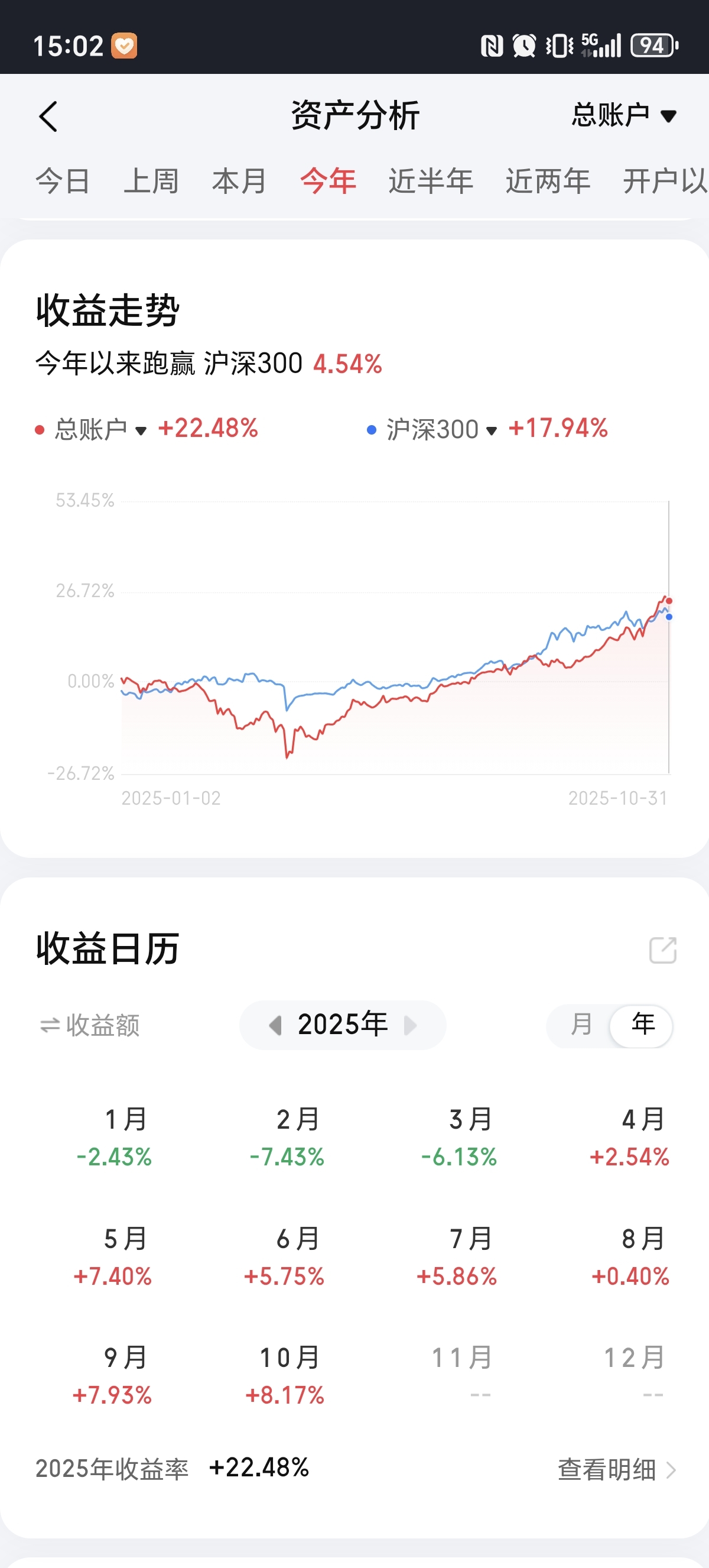 结束10月,大号月线7连阳,小号本年收益率在25%左右。
