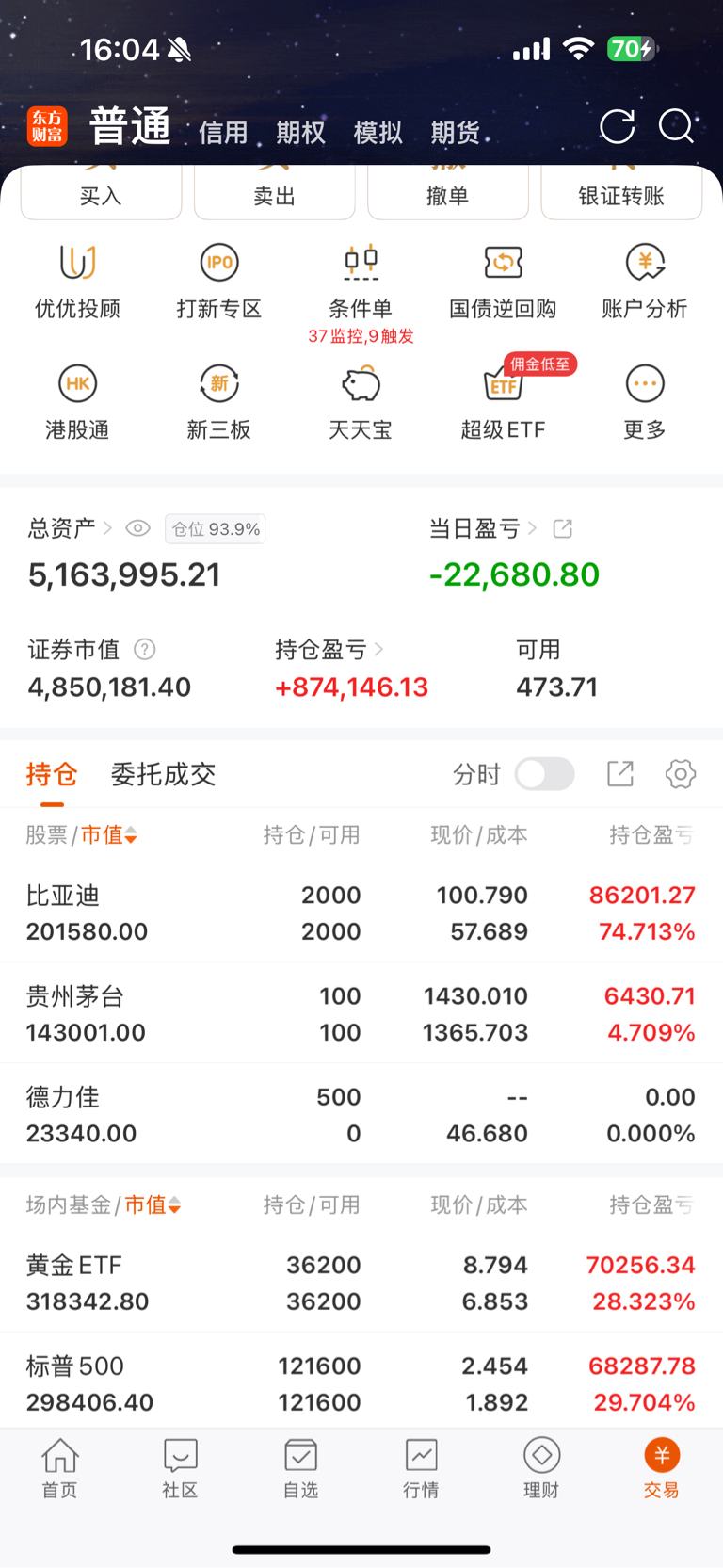 万日定投第171天,今日周定投沪深300ETF五千元,触发条件单9笔,买入7笔,卖出2笔,今日收益: —2.2w