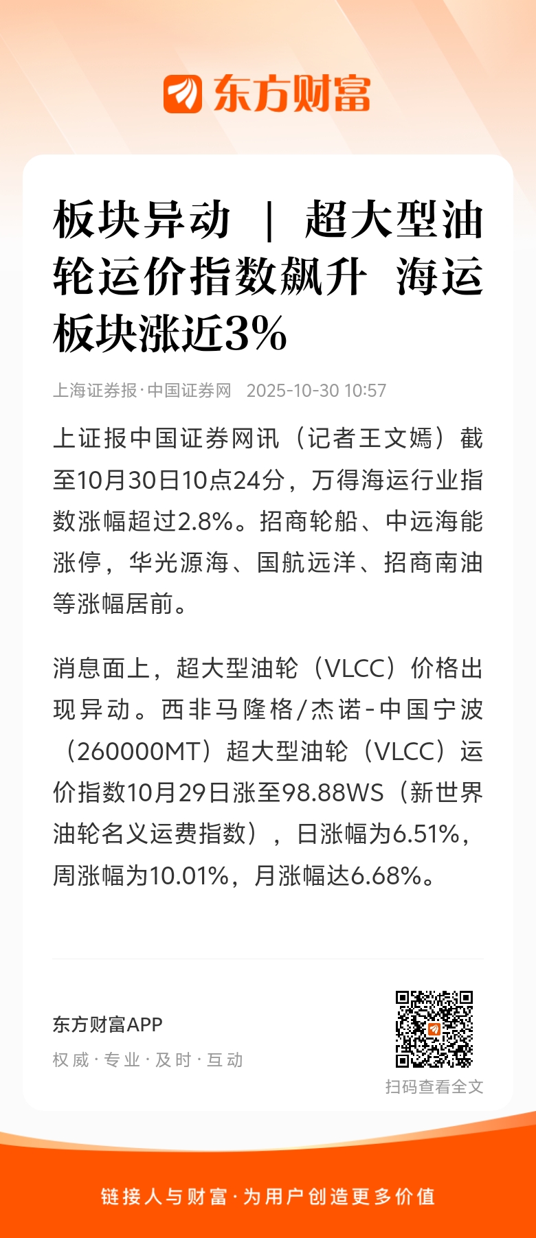 上证报中国证券网讯(记者王文嫣)截至10月30日10点24分,万得海运行业指数涨幅超过2.8%。招商轮船、中远海能涨停,华光源海、国航远洋、招商南油等涨幅居前。