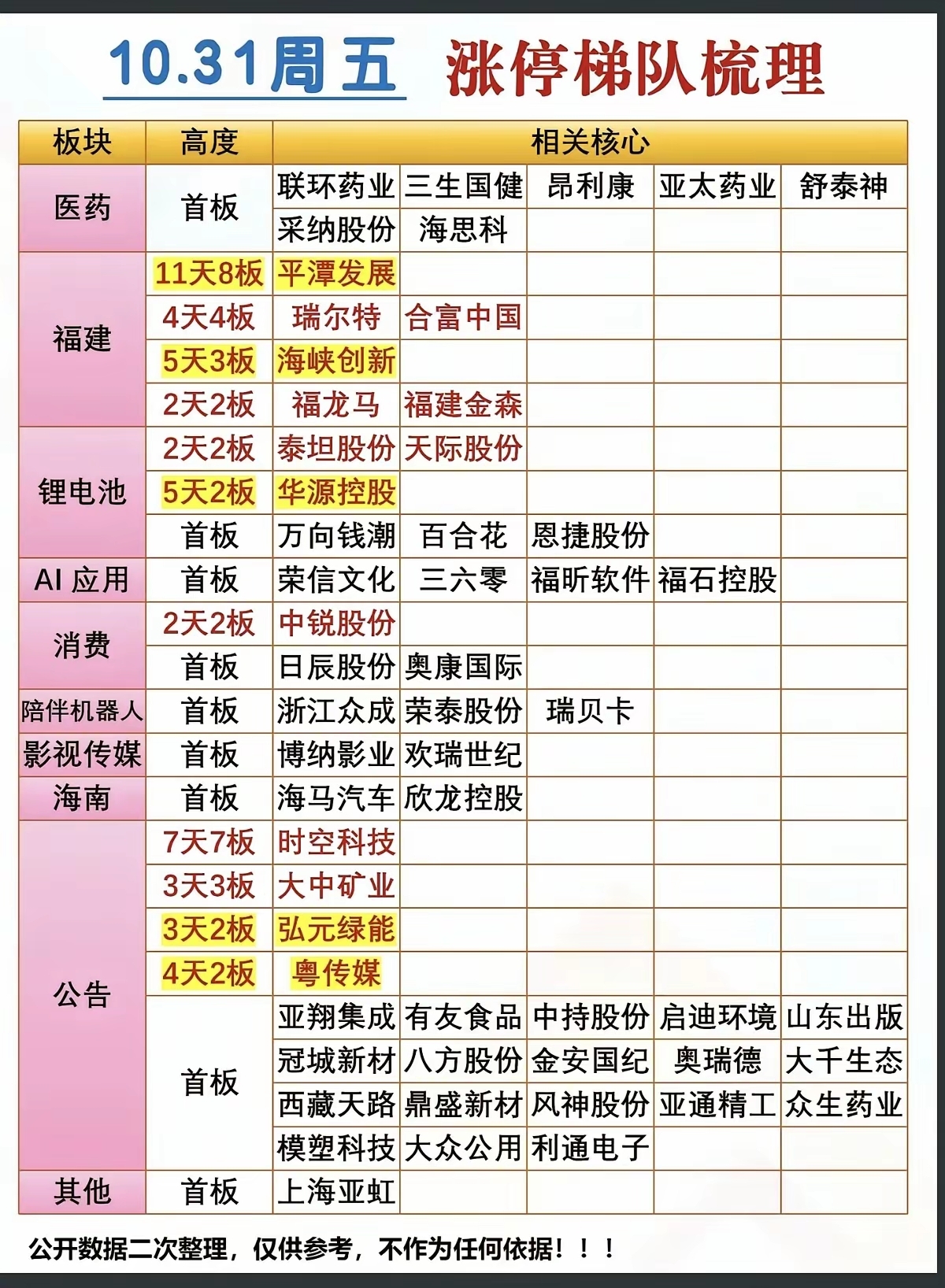 10.31周五涨停板股票梯队+题材!1.医药7股涨停2.福建海峡两岸6股涨停3.