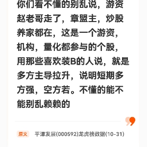 你们看不懂的别乱说,游资赵老哥走了,章盟主,炒股养家都在,这是一个游资,机构,量化都参与的个股,用那些喜欢装B的人说,就是多方主导拉升,说明短期多方强,空方若。不懂的能不能别乱赖赖的 我在《平潭发展(000592)龙虎榜数据(10-31)》的评论获得了大家的关注。